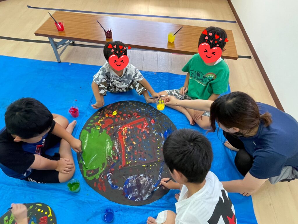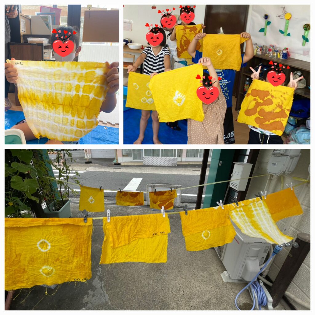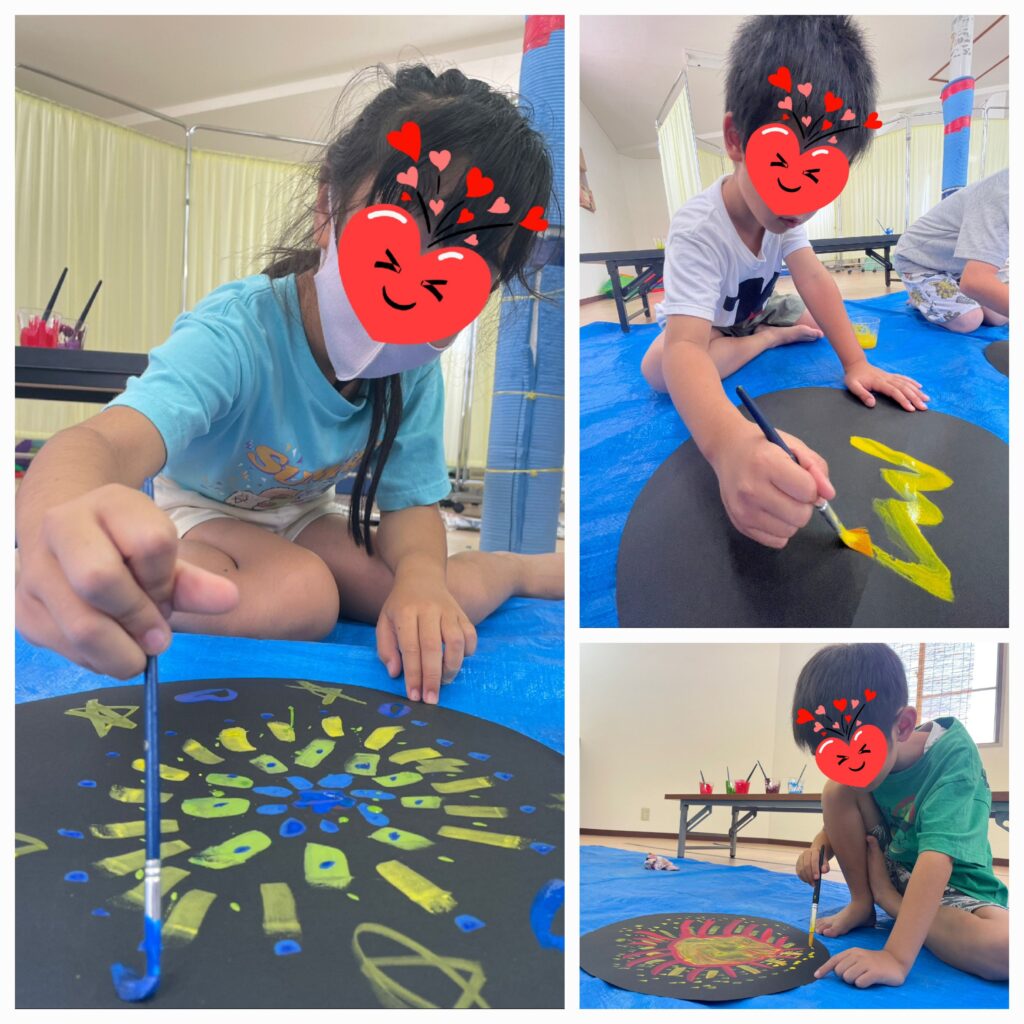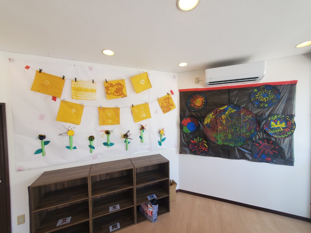 8月の壁面「玉ねぎ染めとお花と花火」が完成しました!7月はいろんな制作に取り組みました😊(職員さん、準備おつかれさまでした🙇)今までに経験のあるものはより工夫して、初めての経験のものはまずチャレンジ!どう仕上がるのか想像しながら作ってくれていました🙆