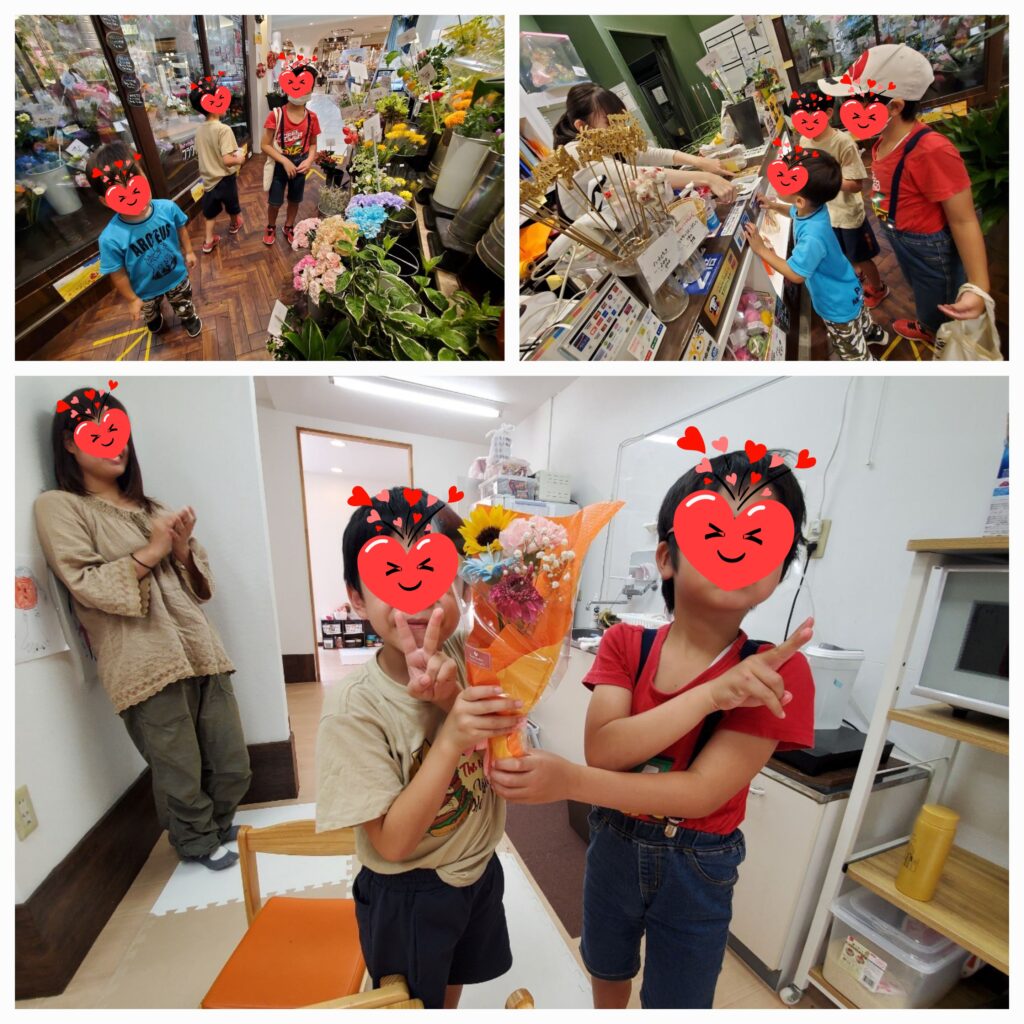 「花束」チームは年中さん小1のミックストリオです。お花を買いに行くのは初めてで1人1本ずつ好きなお花を選んでもらいました。みんなで店員さんに「花束にしてください!」としっかり頼むことが出来ました🙆