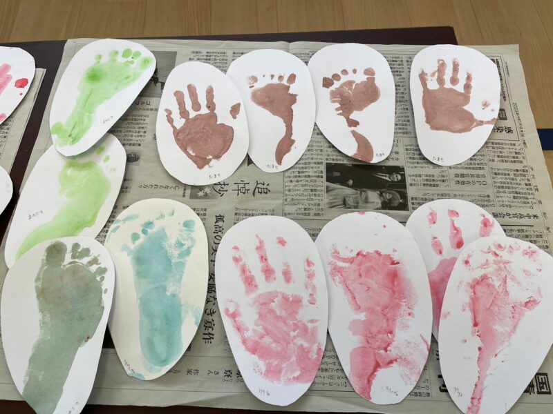 9月の壁面制作スタート!絵の具を自分の手のひらや足うらに塗って画用紙にスタンプしていますね~。どうやら秋口に飛んでくる虫の羽の模様になりそうです🤭 スイカ割りをしました🍉今回は幼児のおともだちが多かったので目隠しはせず、 …
