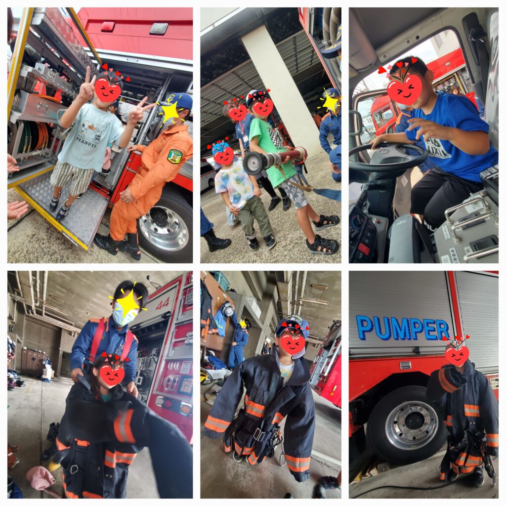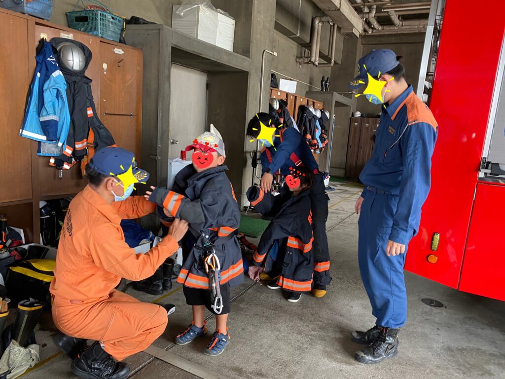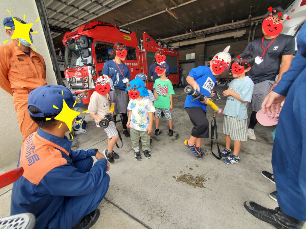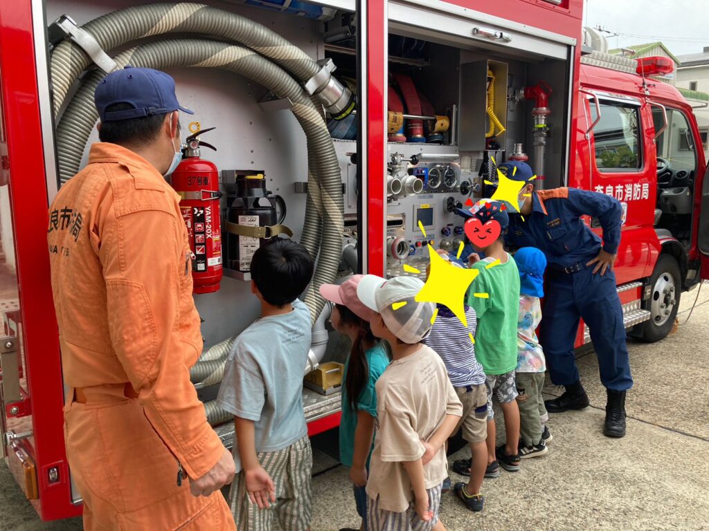 防災訓練で消防署見学(奈良市消防局)に行ってきました📢🚒🚑レスキュー車・はしご消防車・救急車が動いているところを間近で見学させていただき実際に運転席に乗ったり(ワクワク✨)ホースを持ったり(おもたい~💦)消防服も着せてもらえました(かっこいい👍)消防士のみなさんが温かい雰囲気で子ども達に接してくださり、とても楽しくて貴重な体験を得ることが出来ました。ありがとうございましたm(_ _)m