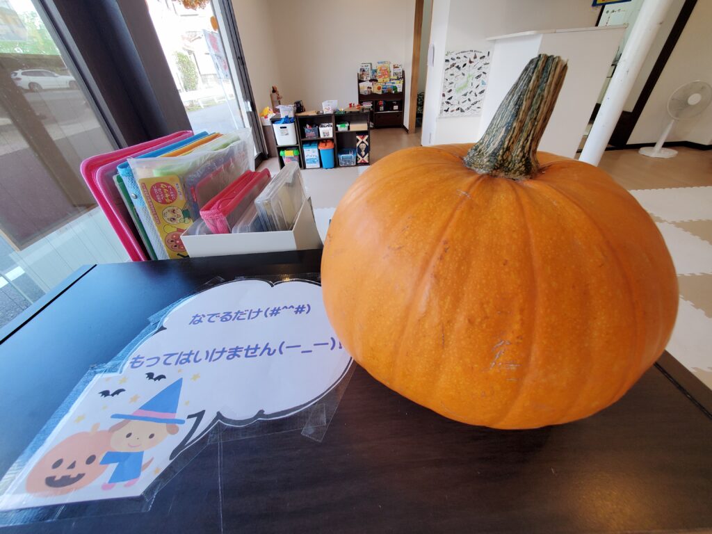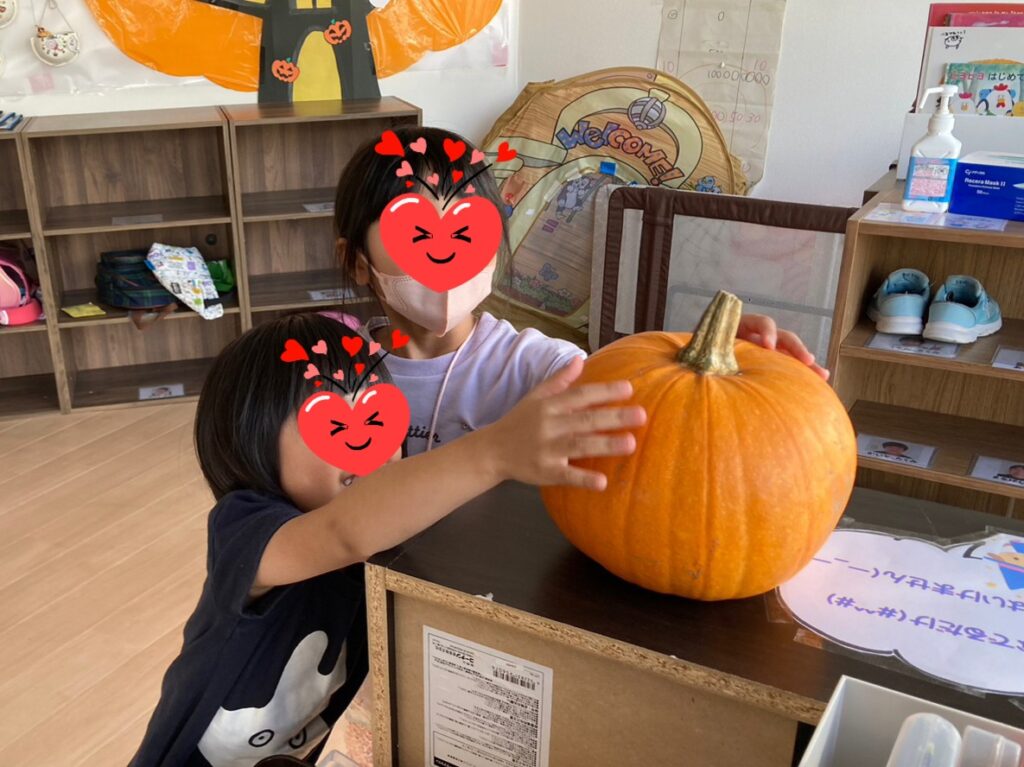 職員さんが立派なオレンジのカボチャを探してきてくれました🤭下駄箱でさっそく見つけた子ども達は「なにこれ~!?」とナデナデしたり🫱ペシペシしたり🫱グルグルしたり👋興味深々の様子でした