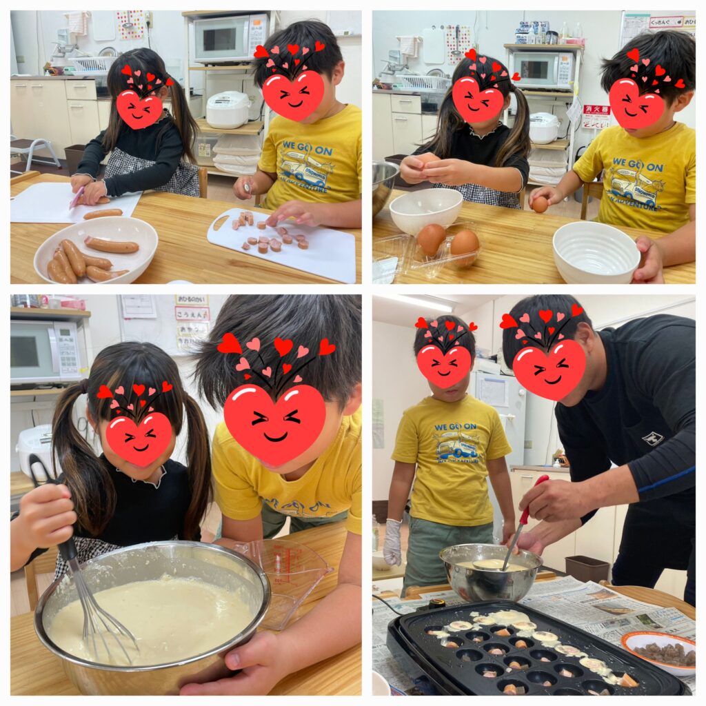 第2弾は「たこ焼きパーティー」具材を切って卵を割って生地作りの工程はもう子ども達だけで作れています🙆ホットプレートでクルクル焼いたらアツアツたこ焼きの出来上がりです🤗10個以上食べてる子もいましたよ~😝