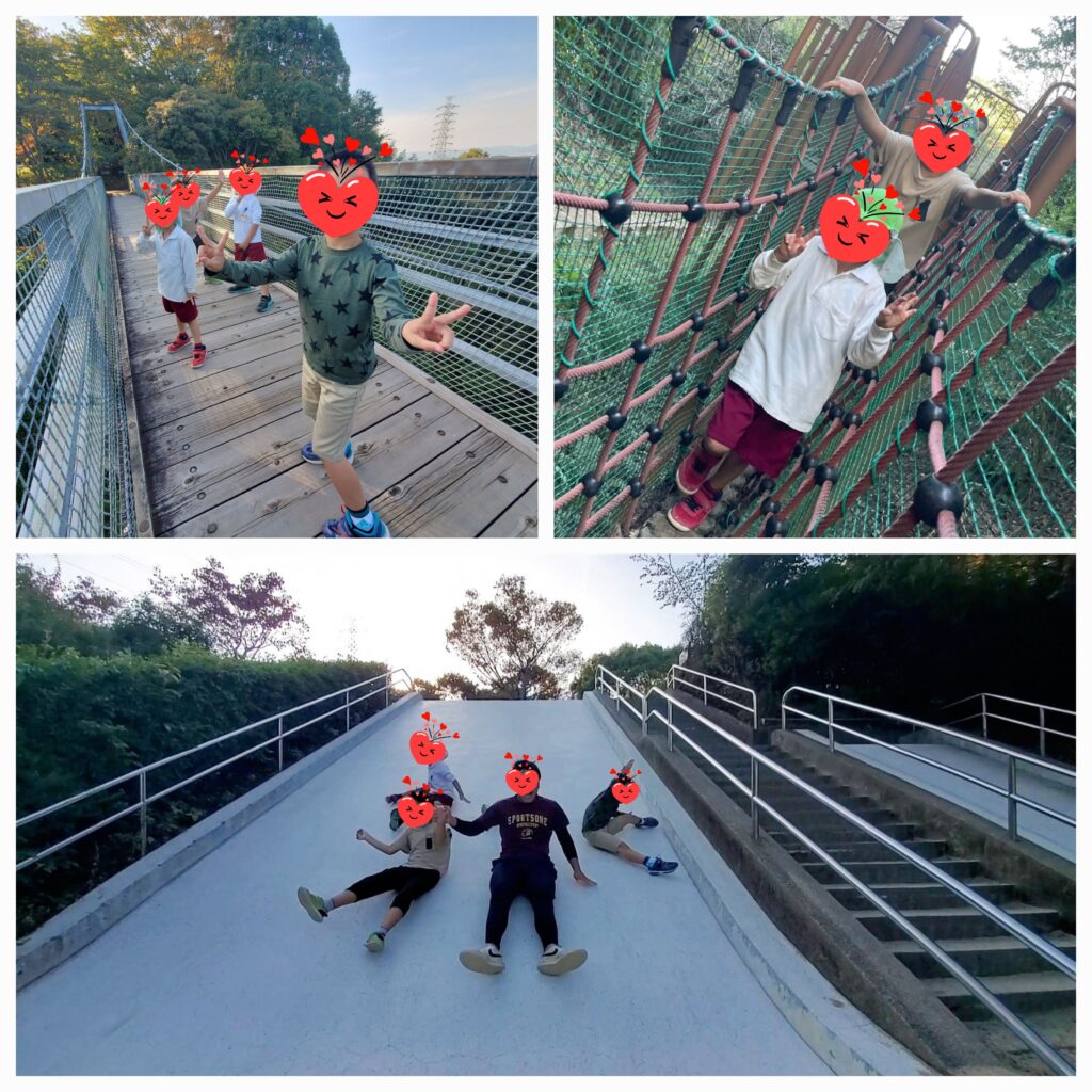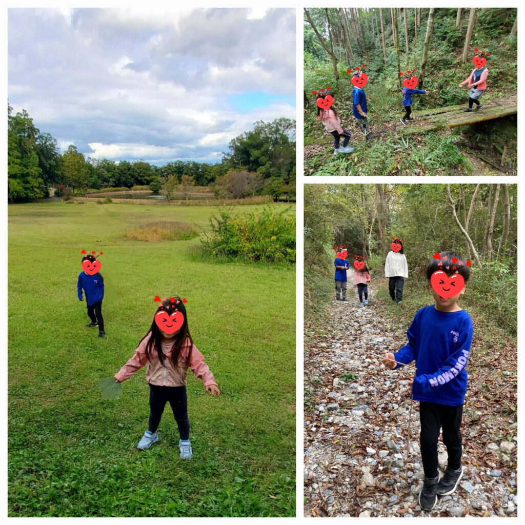 天気の良い日は自然の中で体を動かすのが最高に気持ち良いです🌳「あっちにもこっちにもいいっぱい落ちてるよー!」とドングリをたくさん拾いました😊吊り橋、滑り台、アスレチックはお友達と一緒なら全然怖くないぞー!と駆けだしています😝ハイキングコースでは石のゴロゴロ道、細い木の橋、登り降りが急な階段もしっかり歩ききることが出来ました🤗