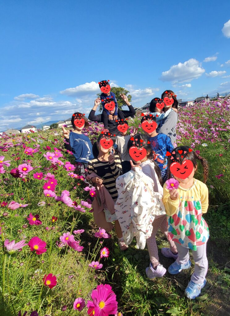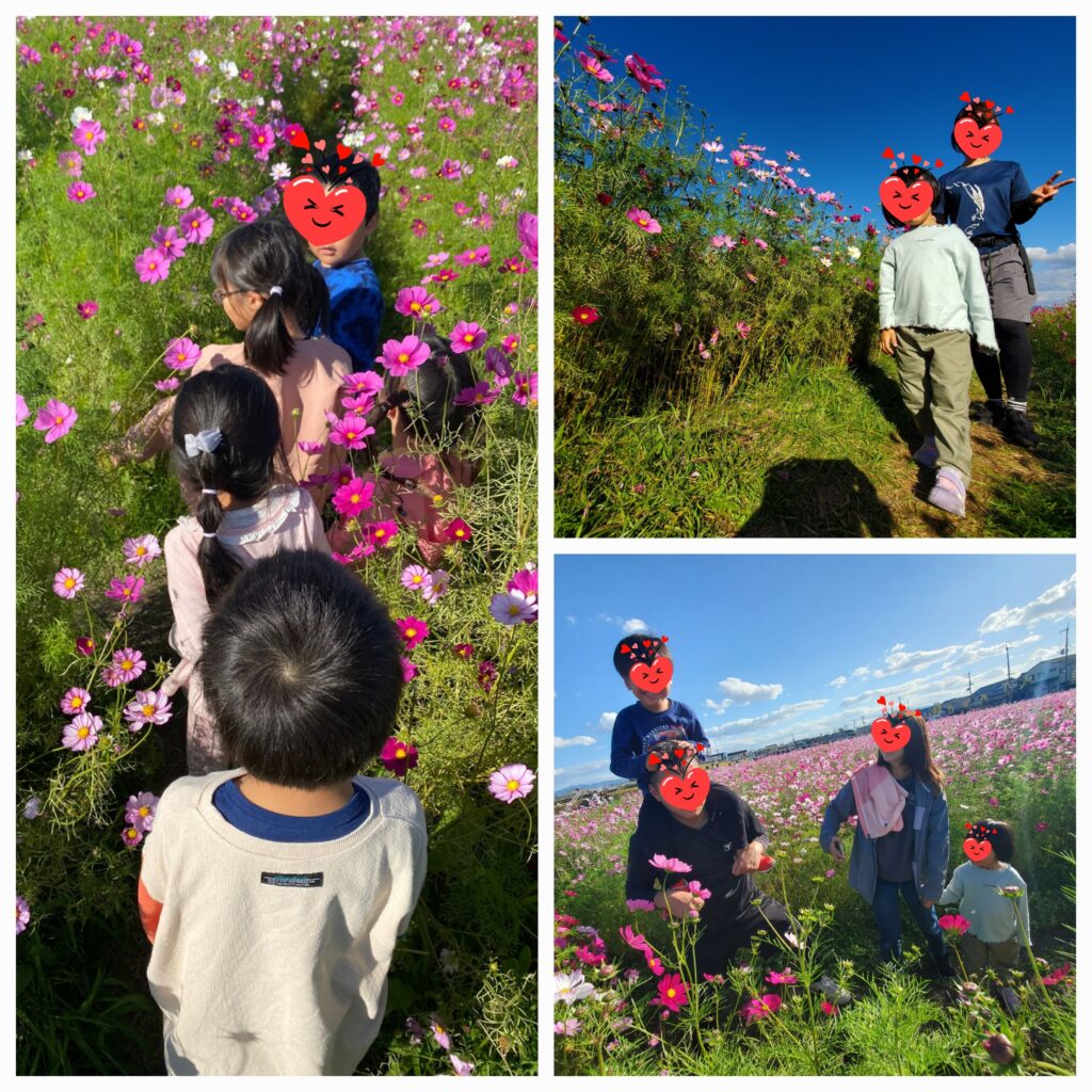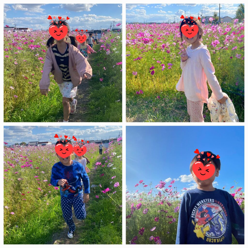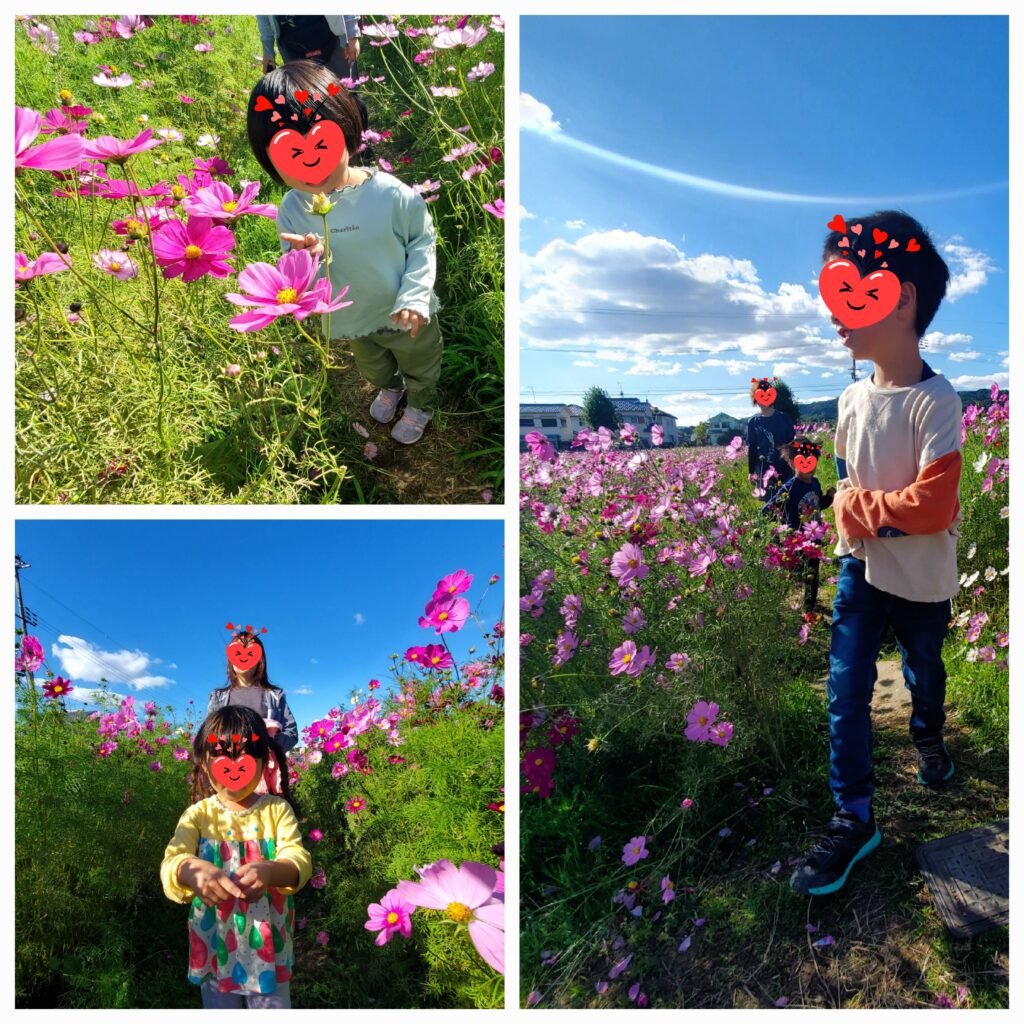 史跡中宮寺跡歴史公園へコスモス散策に出かけました🌺一面に咲いているコスモス畑の中は子ども達の目線の高さにお花があり、別れ道がくると「あっち?あれ?こっち!」と選びながら自由に走りまわってまるで迷路の中に入り込んでしまったかのような感覚になっていました🤭青い空、白い雲、ピンクと緑のコスモス、そしてとっても楽しんでいる子ども達・・全部が合わさったその光景を見ることができてめっちゃ良い時間をいただきました🥰
