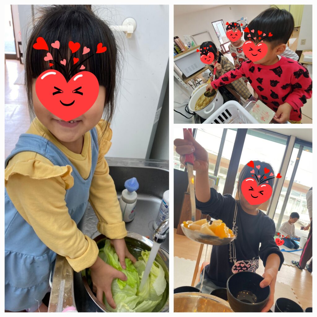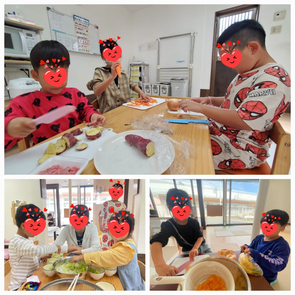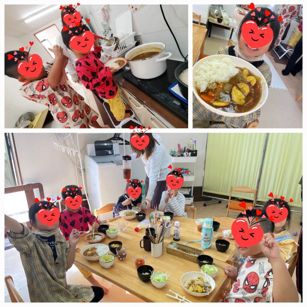 昼食クッキングで「さつまいもカレー🍠」「サラダ🥗」「フルーツポンチ🍌」を作りました😄年中さんから小学3年生のお友達までみんな仲良く調理できてるところがすごくいい!!お鍋に野菜やお肉を入れてコトコト煮えてきたらすかさずカレールーを投入です😚サラダやフルーツポンチの盛りつけも上手にできました🙆自分で食べられる量を考えてご飯をよそってカレーをかけたら「いただきます!」と全員そろってご挨拶。「ぜんぶ食べたよー!」「おかわりするー!」「いつもは嫌いやけどちょっと食べれたー!」とたくさん感想を教えてくれました😊