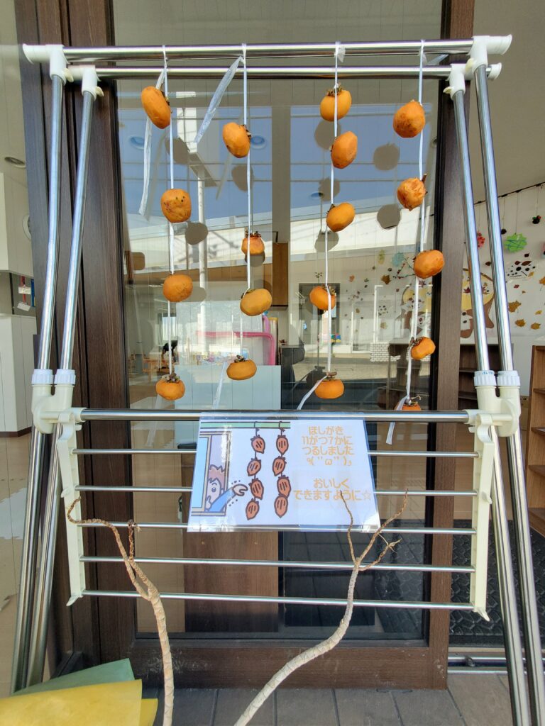 今年もまた「干し柿」を作りました😊渋柿の皮を剥いて熱湯消毒した後みんなにはヒモで結んで吊るしてもらいました✨「おいしそう!」「どんな匂い?」とお話してくれましたが「干さないとおいしくならないんだよー😚」と言うと「???・・・」不思議そうな顔をしています🤔1ヶ月間くらい柿が変わっていく様子を見ながら食べごろになるのを楽しみにしててね~😝