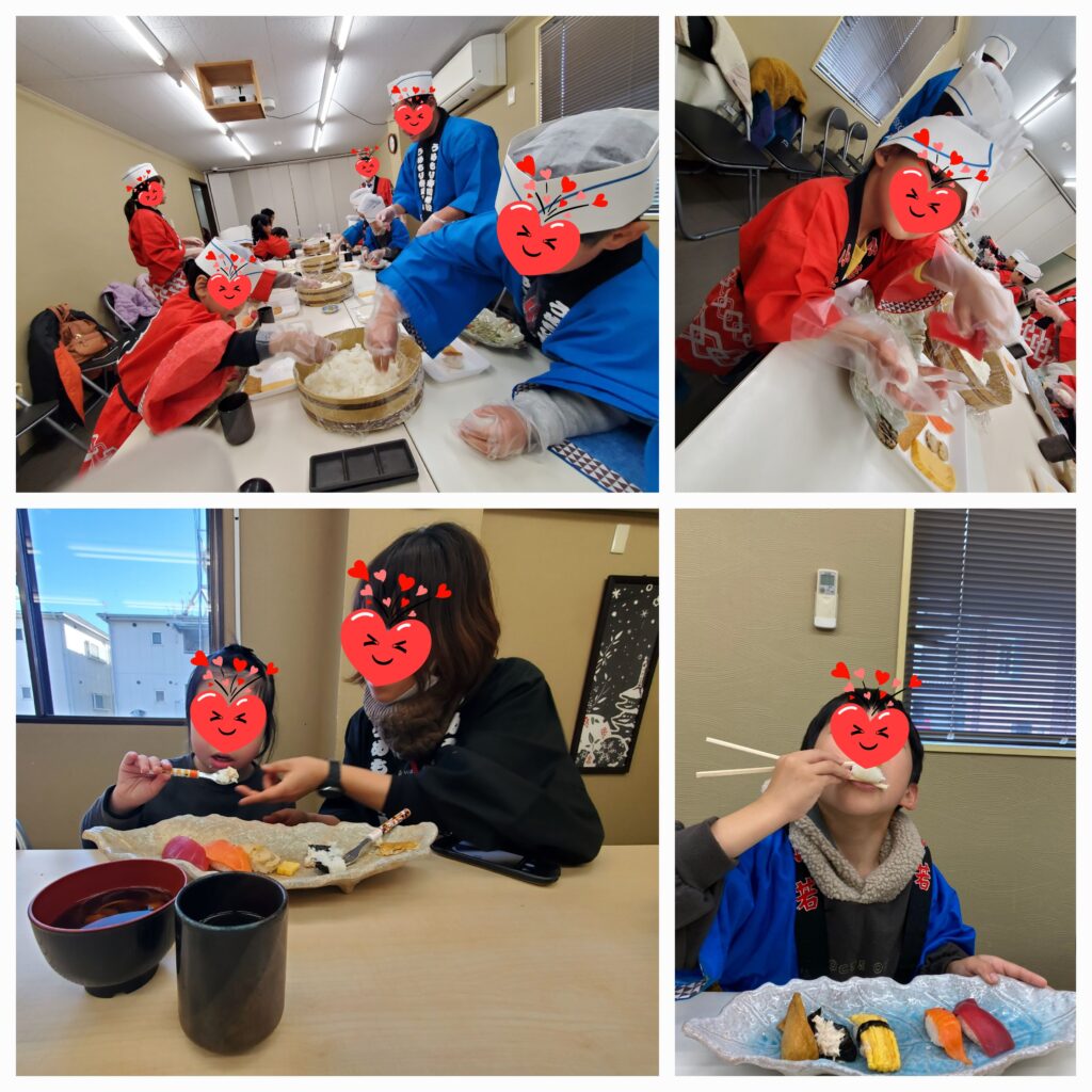 自分で作ったお寿司とみんなで食べている雰囲気で苦手だったネタもペロッと食べているお友達や時間をかけて一貫ずつとっても大事に味わって食べているお友達もいました😊最後に賞状を頂いて子ども達職員さんも含めて総勢14名、無事に寿司学校を卒業することが出来ました!