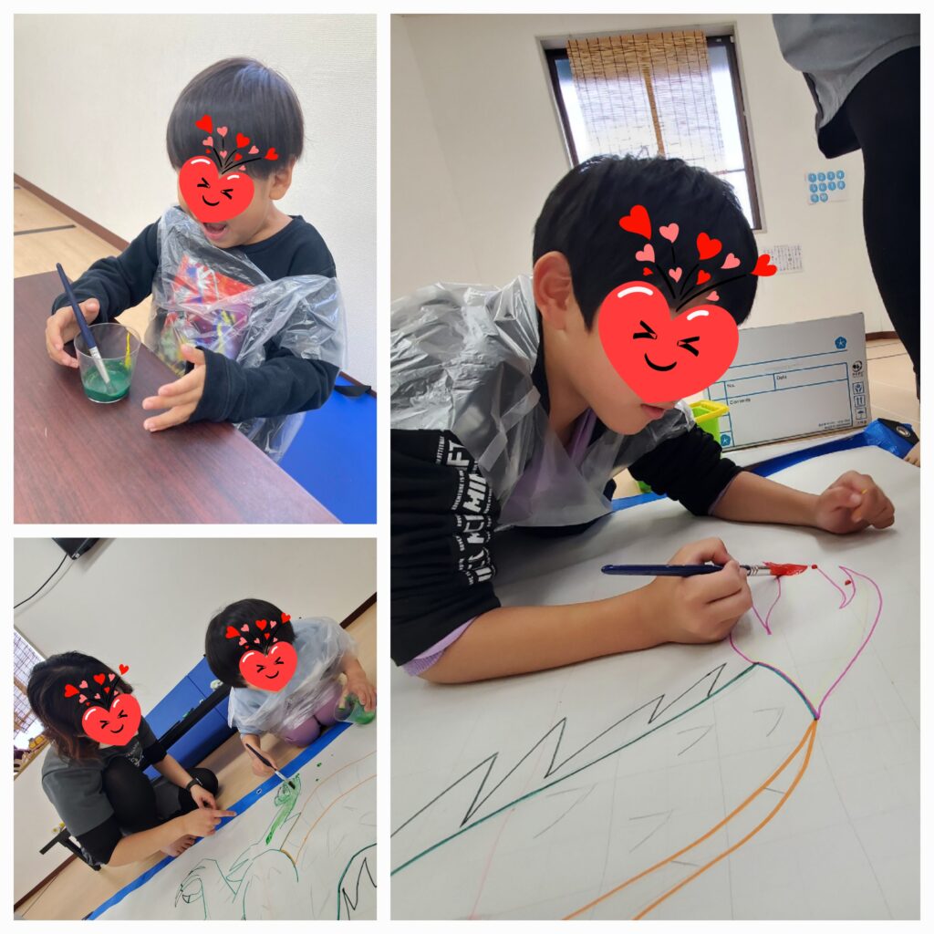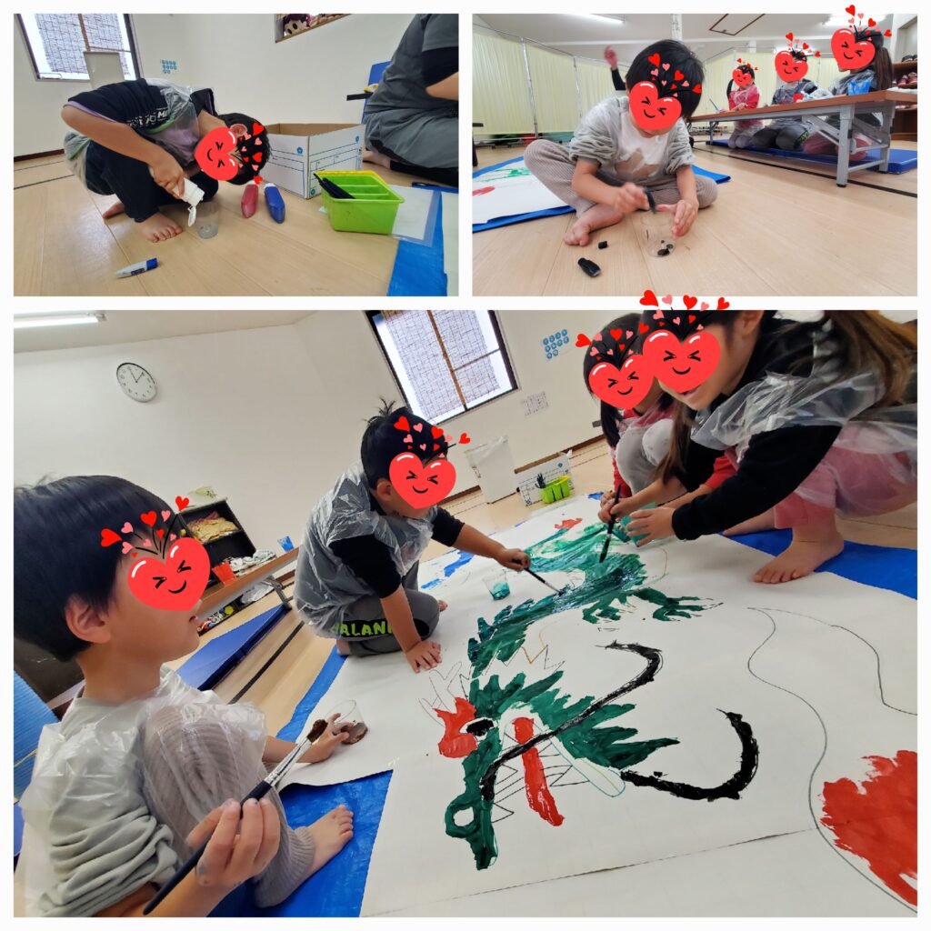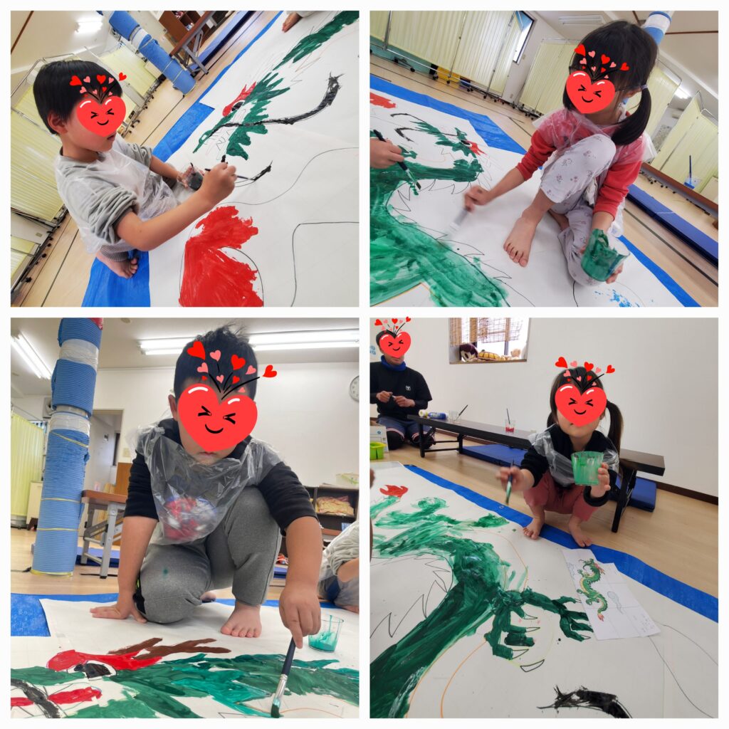 1月の壁面制作スタート!大きな模造紙に描かれた2024年の干支を絵の具で塗ってもらいました🐉来年も良いことあるように願いを込めて。。