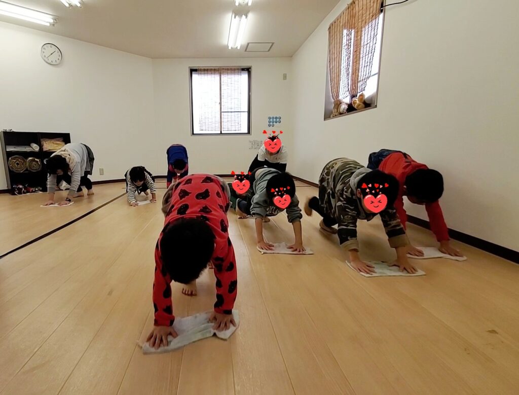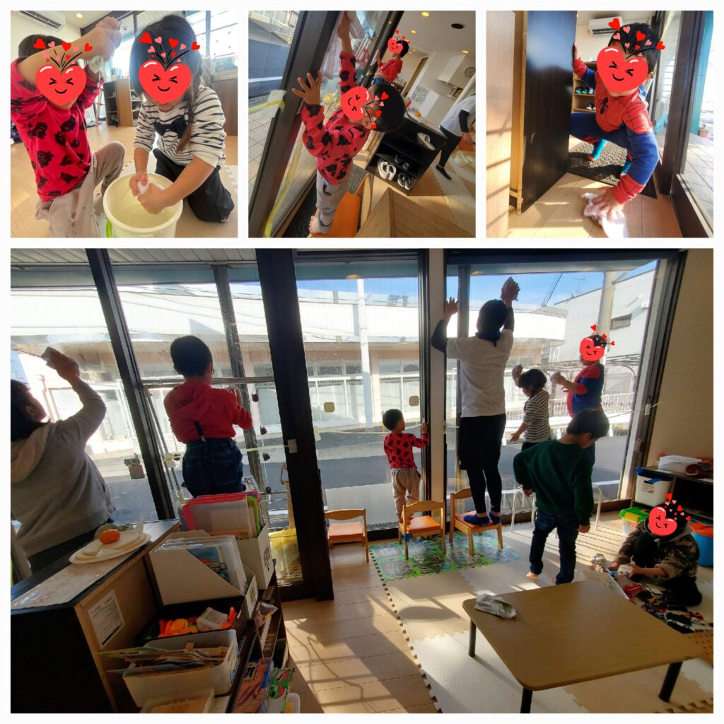 今年最後のゆうは「おおそうじ」をしました😊ぞうきんをよく絞ってからおもちゃの棚や窓を拭いてもらいました。普段車のおもちゃでよく遊んでいるお友達はたくさんあるミニカーをひとつひとつ最後まで拭いてくれていました🚗🚙最後に2階の床拭きです。「位置について~よーいスタート!」の掛け声で一斉に雑巾がけが始まりました!みんなのおかげでゆうがキレイになったよ~ありがと~🥰