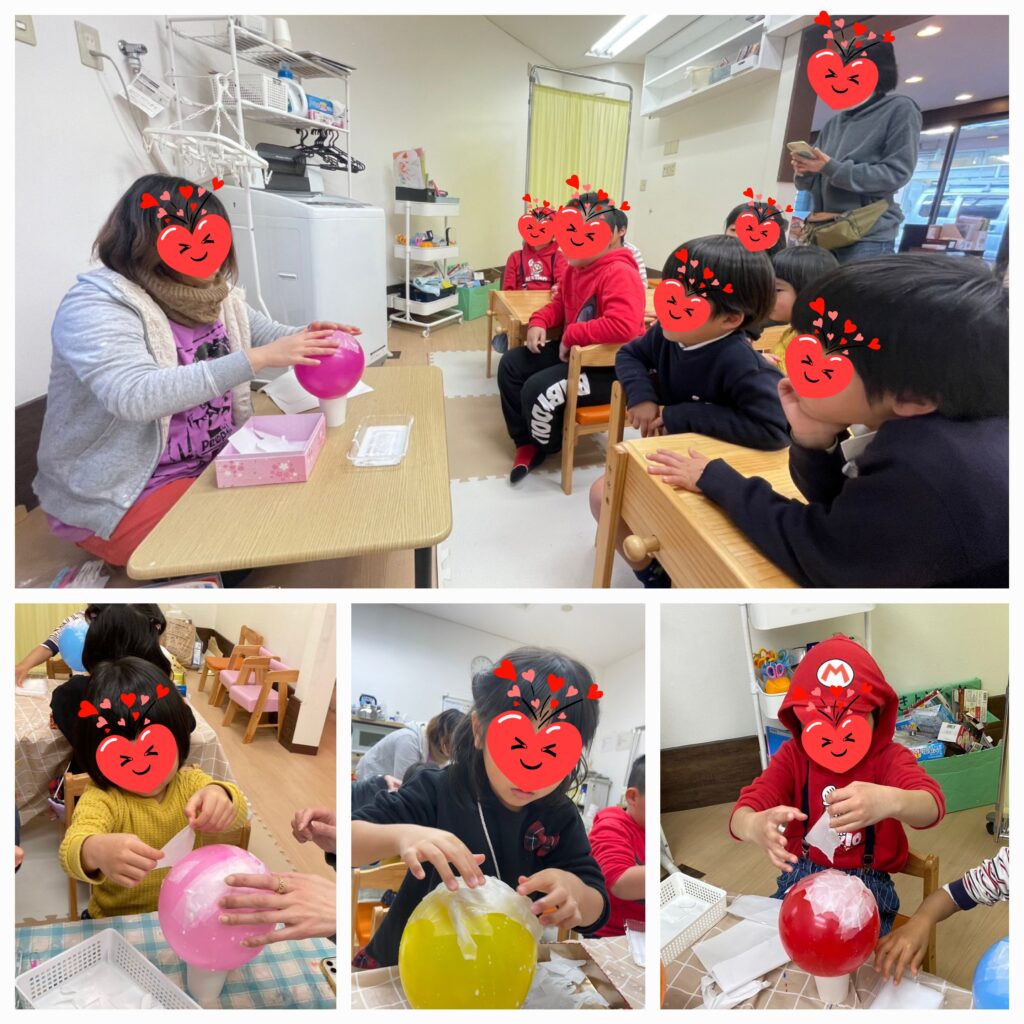 2月の壁面制作スタート!風船をふくらませて半紙をペタペタ貼りつけているようですね~🤔これはもしや雪だるま⛄!?半紙が乾いてからの仕上がりが楽しみです🤭