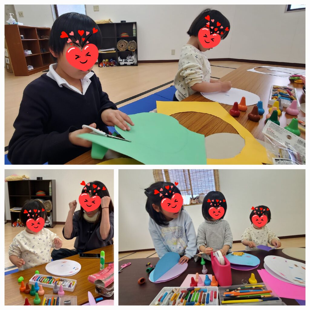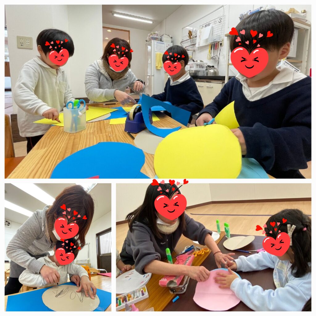 3月の壁面制作スタート!画用紙を丸く切って、つなぎ合わせたり絵を描いたりしています。。🤔大空に浮かぶアレらしいです🎈