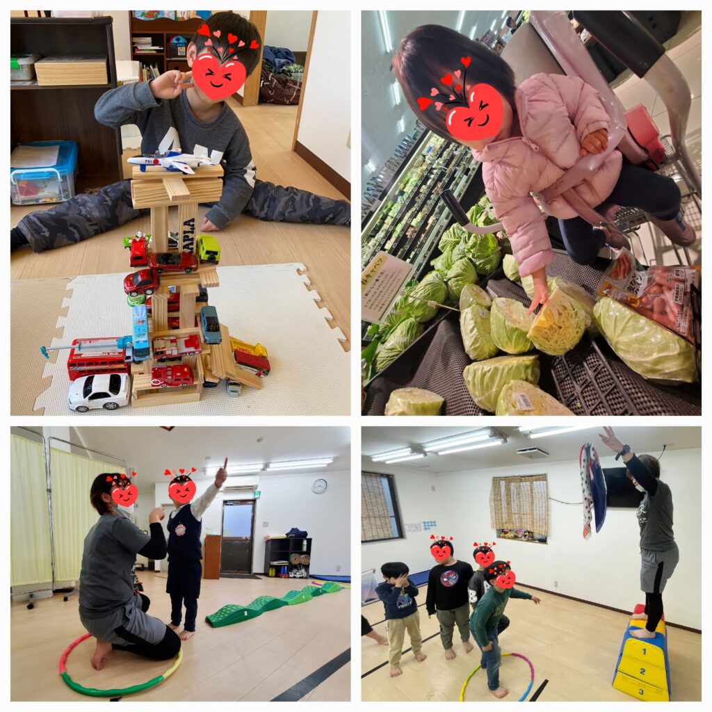 室内でカプラを積み上げ飛行機や車のおもちゃを乗せました。かなりの自信作のようです😆スーパーに買い物に出かけました。キャベツの大きさはこれでいい?と見せてくれました😚サーキットでは平均台を歩いてからのあっちむいてホイや布が落ちてくるのをよく見てタイミング良く掴むゲームをしています😀