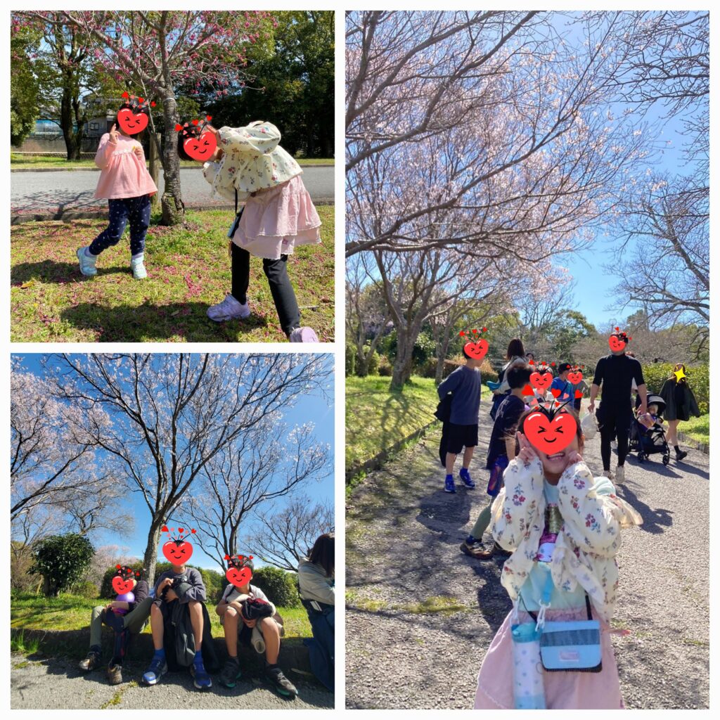 2日目は「大和民俗公園」に行ってきました😊3色丼のご飯とおかずをもりもりパックに入れてくれる男の子達😝お姉ちゃんの入れ方を真似しながら、そ~っと盛りつけてくれる年中さんの女の子🤗お弁当をたくさん食べて芝生に寝ころぶのも気持ち良いね~😚桜もすこ~しずつ咲いてきました🌸