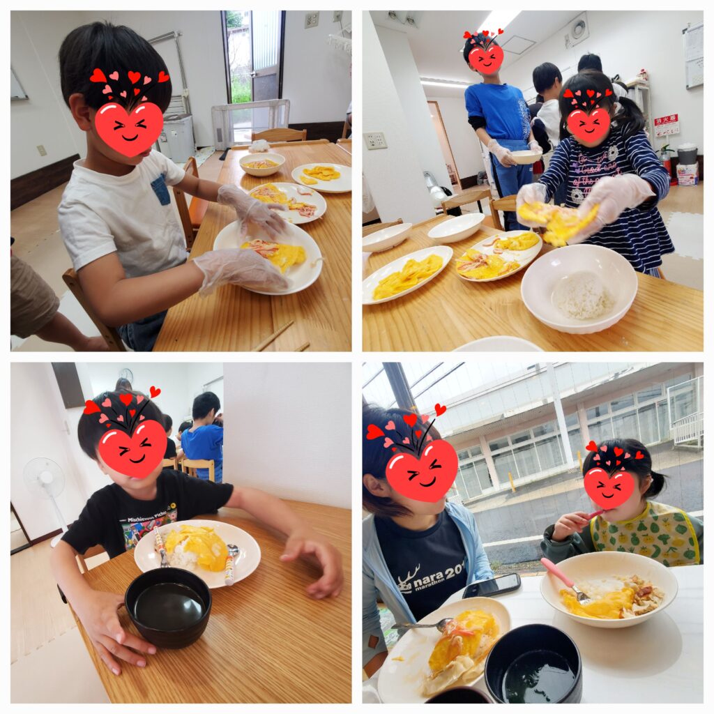 昼食クッキングで「天津飯」「ぎょうざ」「中華スープ」を作りました😊お水を量ったり卵を割ったりフライパンやホットプレートも使いながら、それぞれのグループで食材を調理していき最後はひとりずつ自分が食べられるご飯の量をよそって天津飯を仕上げてもらいました😆