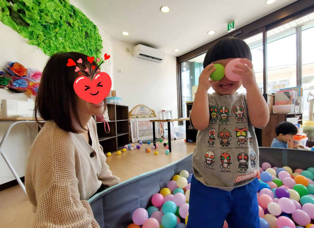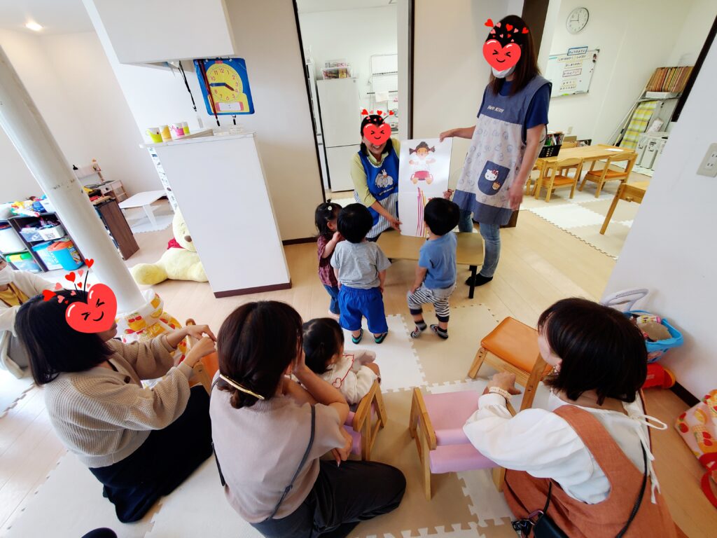 5月2回目のみんなのひろばが開催されました😄ハサミやスティックのり、パズルやカラーボールなど目につく物すべてに興味いっぱいな様子🤭たくさん遊んだ後は大きな絵本「ぴよ~ん」🐸を読んでもらい、つられてみんなも「ぴよ~ん」🐸して遊びました🥰(市社会福祉協議会の方が見学に来られました。子ども達とも遊んでいただきありがとうございました。)
