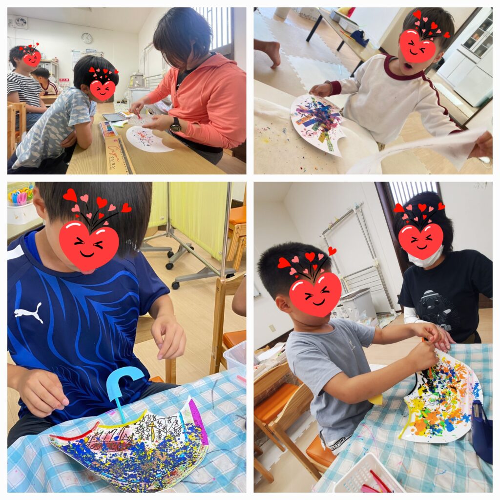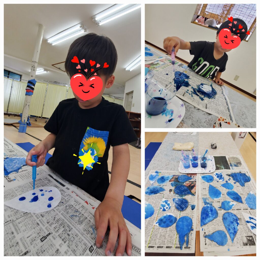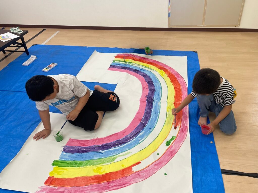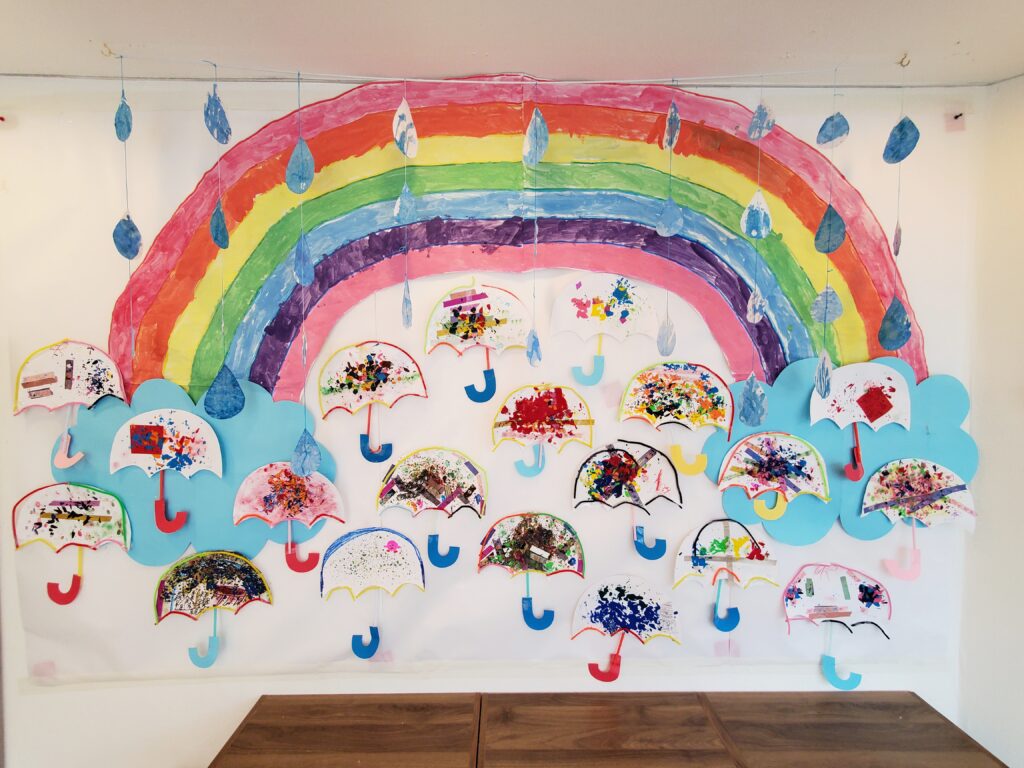 6月の壁面「傘と雨と虹」が完成しました😊「あ~めが~あがったよ~☔おひ~さ~まがでてきたよ~🎶あおいそらの~むこうに~は~🎵にじが~かかった~よ~🌈」メインの傘はもちろんのこと、虹は筆で雨のしずくはスポイトで綺麗に色を塗ることが出来ました~😚