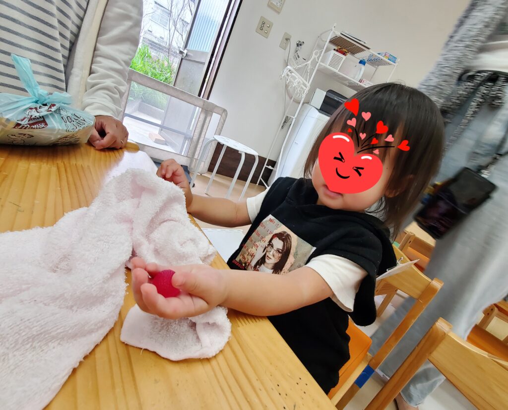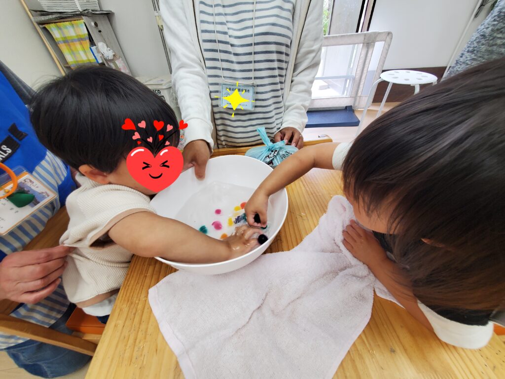 6月1回目のみんなのひろばが開催されました😄今日は水に浸すと膨らむボールで遊びました🔴🟠🟣🔵🟢小さかったボールが少しずつ膨らみグミみたいな弾力となり、子ども達もママもスタッフさんもどうなっていくのかみんなで覗き込んでいます~😊