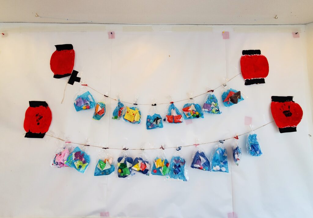 7月の壁面「きんぎょとちょうちん」が完成しました😊みんなでそろって折り紙。。けっこう貴重な時間かも?園児のお友達は見本を見ながら折り方を覚えたら次は見本を見なくても折れるようになりました😚小学生のお友達は自分でアレンジを加えオリジナルきんぎょを完成させていました🤗