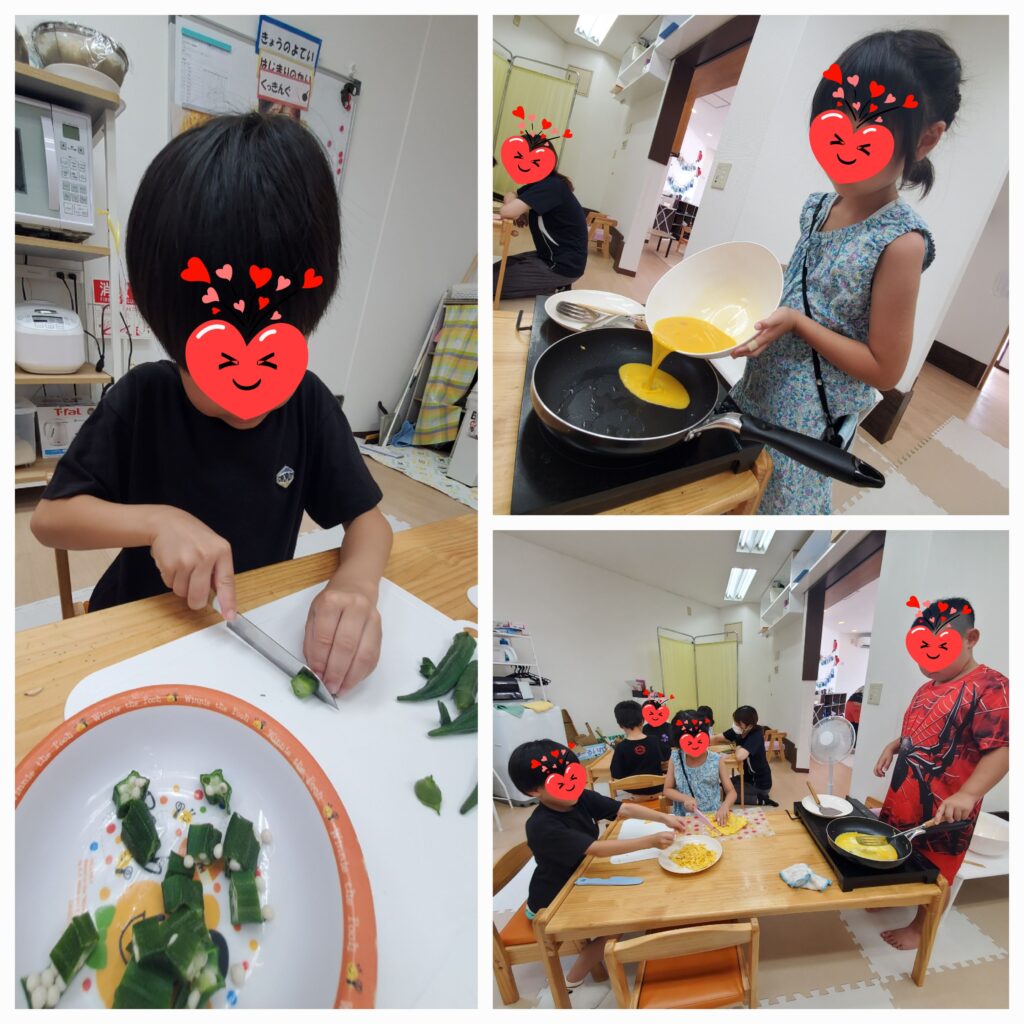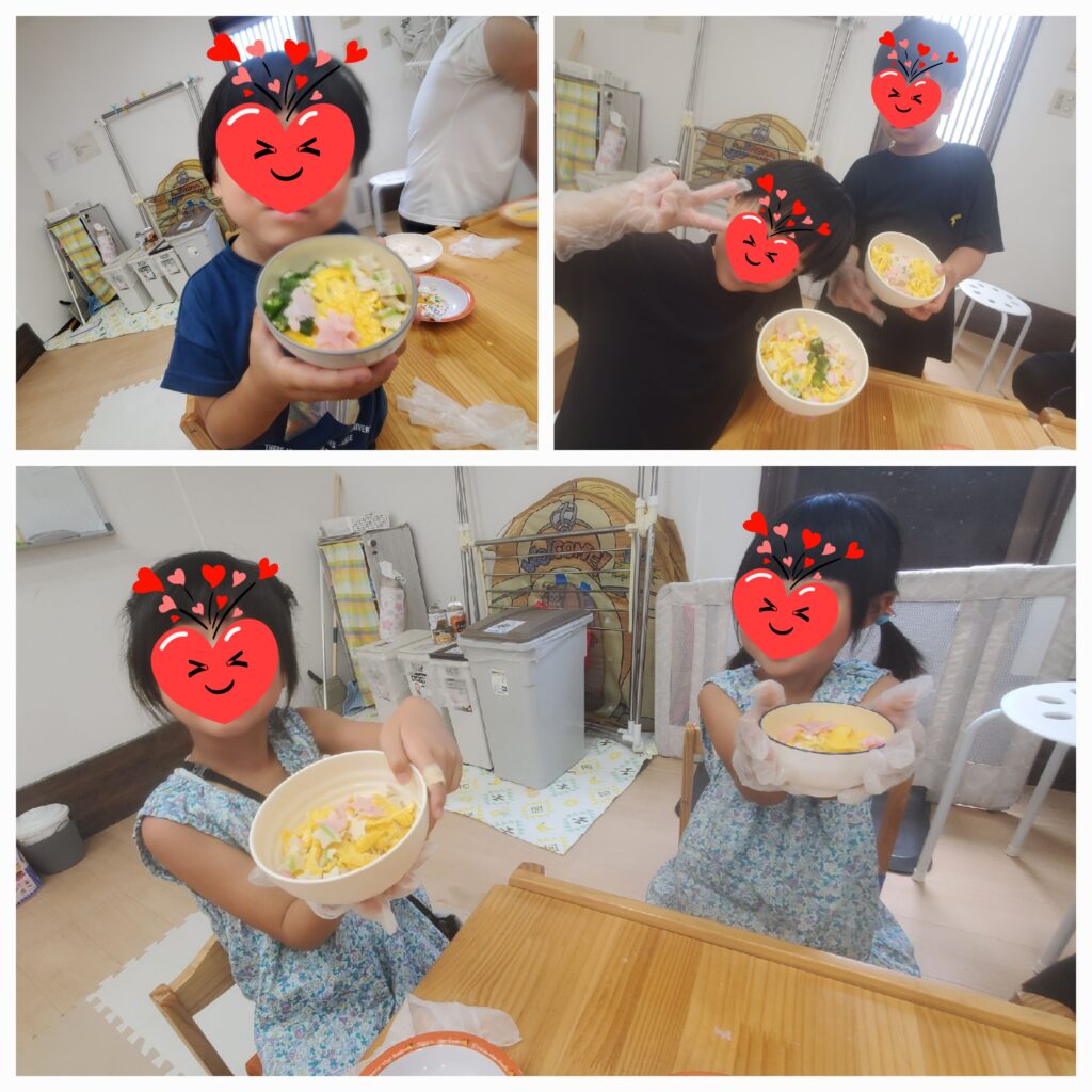 おにぎり、フルーツポンチも美味しく出来ています~😊最近ますます、みんなの料理の腕が上がってるな~😝「きらい~食べれない~」と言っていた子もワイワイ楽しく作ると少しずつ食べれるようになるんですよね~😋