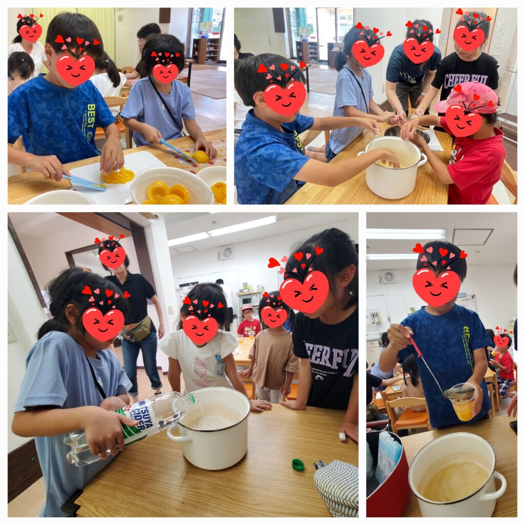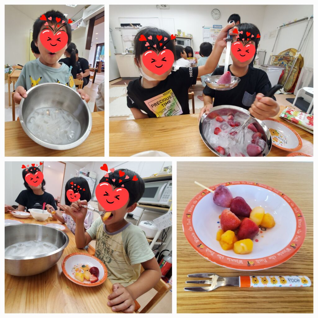 おやつクッキングで「タンフル」を作りました🍓氷カルピスに氷イチゴ・氷マンゴーを入れてかき混ぜると表面がカルピスの白い膜でおおわれますよ~😧「理科の実験みたい!」おもしろい感想もいただきました!
