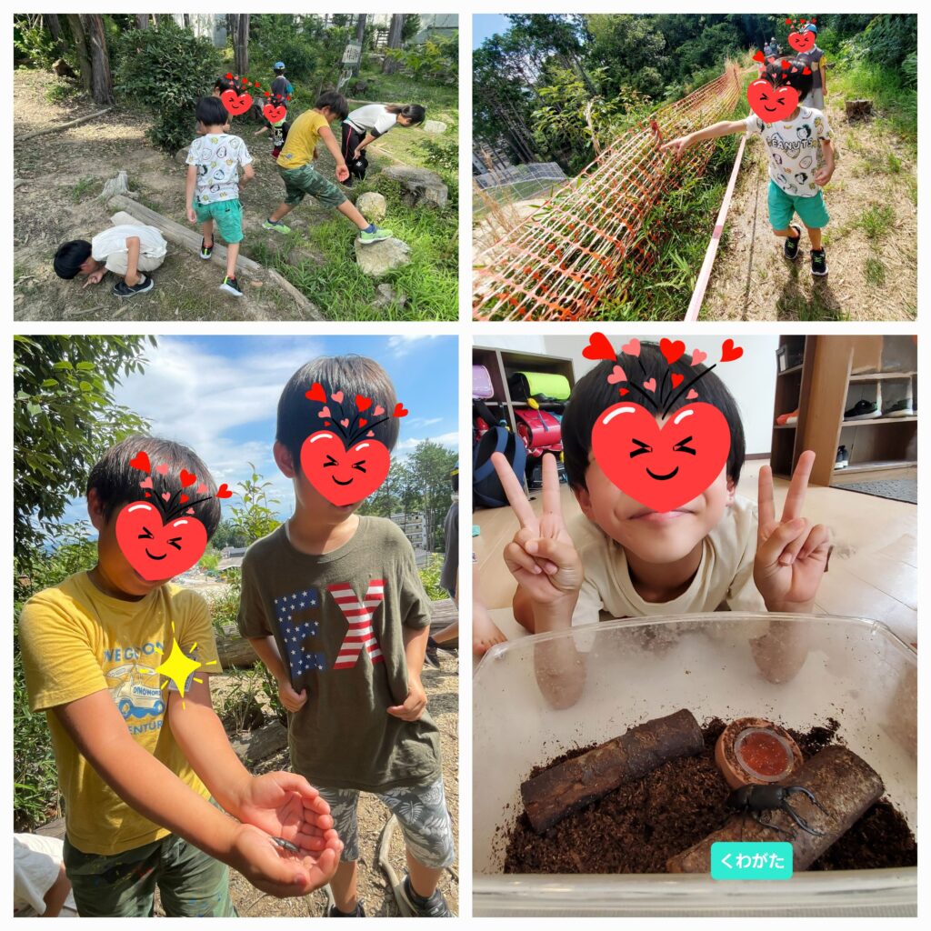 運動遊びで「わんぱくの森」に行ってきました🦗みんなで昆虫を探しに森の中に探検です😆樹液に集まっているカナブンを観察したり、樹の皮の裏側をのぞいてクワガタも見つけることが出来ました😚