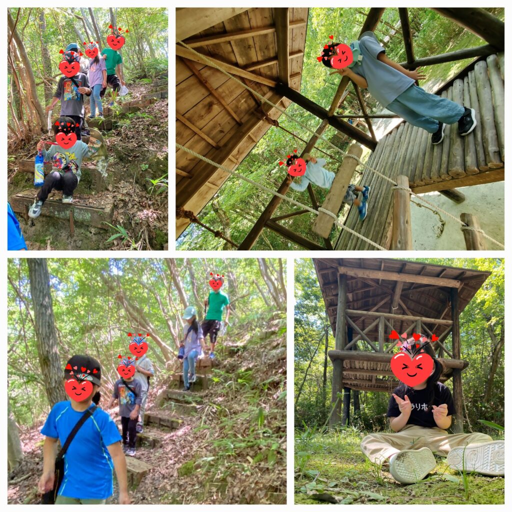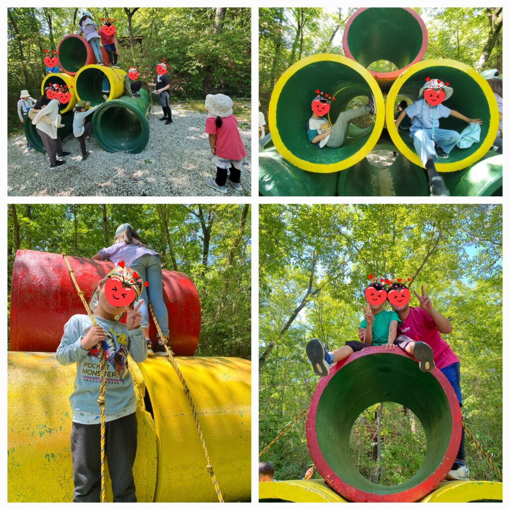 森の入り口でさっそく大きな土管やツリーハウスを見つけてロープや縄梯子を使って上に上に登ったら「はいチーズ📸」。。。「でもこれどうやって降りるの~?助けて~💦」。。。職員さんにゆっくり降ろしてもらいました😓