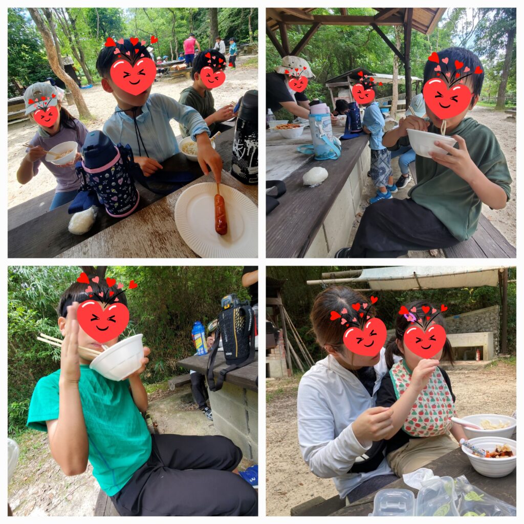 こちらは火おこしに挑戦!炭に火がつき出したら小学生の男の子達がちょうど良い火加減になるまでうちわであおいでくれました😚暑い中よく頑張りました~😝しょうゆを塗ったおにぎりとフランクフルトを焼いてる間に冷やしうどんをいただきます!お外で食べる昼ごはん最高😆