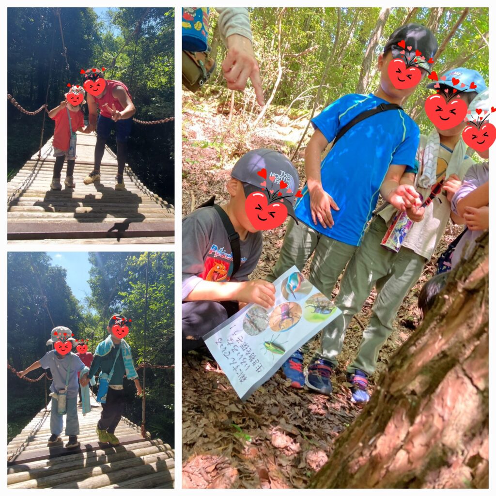 午後からは森の奥へ探検開始!揺れる冒険の橋を渡ったら、昆虫探しをしながらアップダウンの多い凸凹道や泉のまわりを一列に並んで前に進んで行きます💦