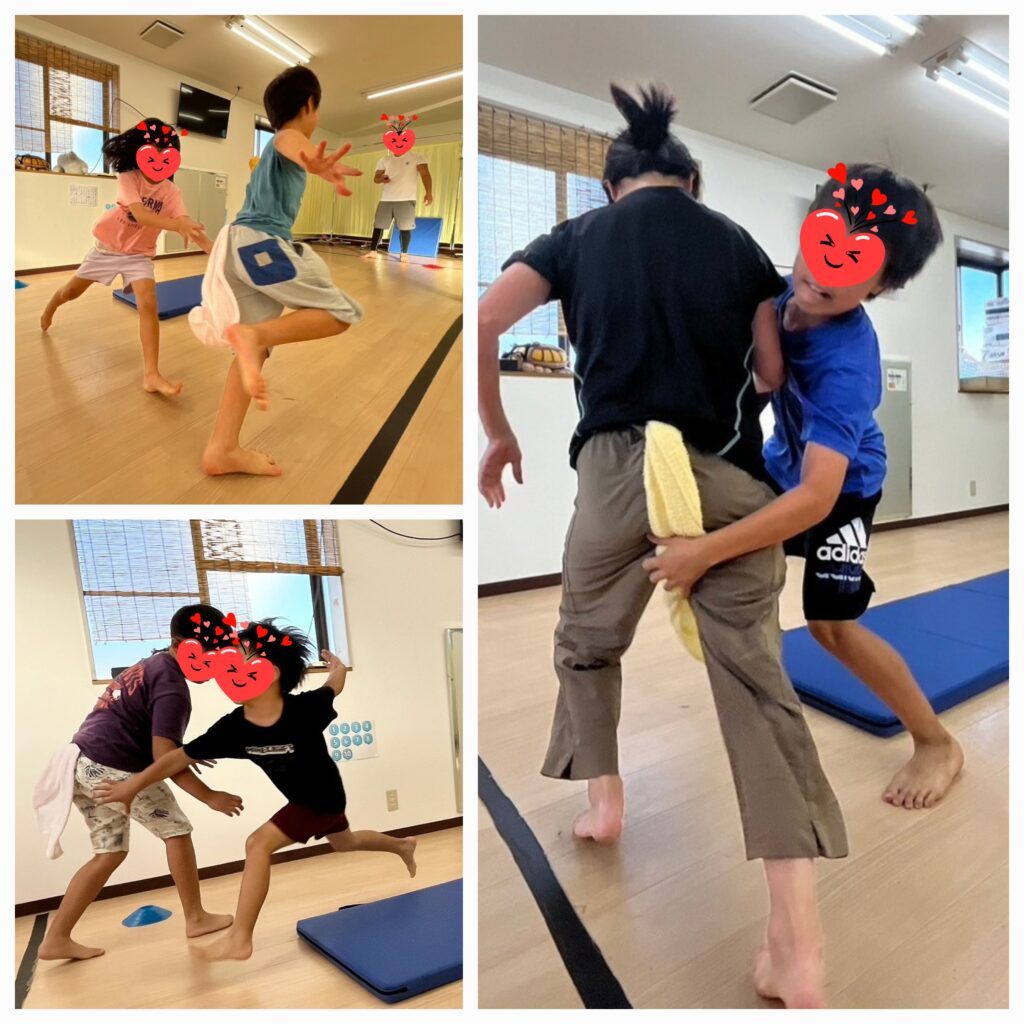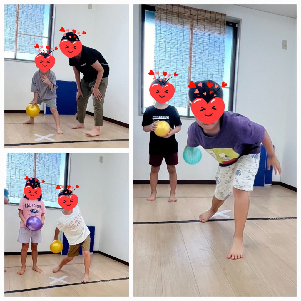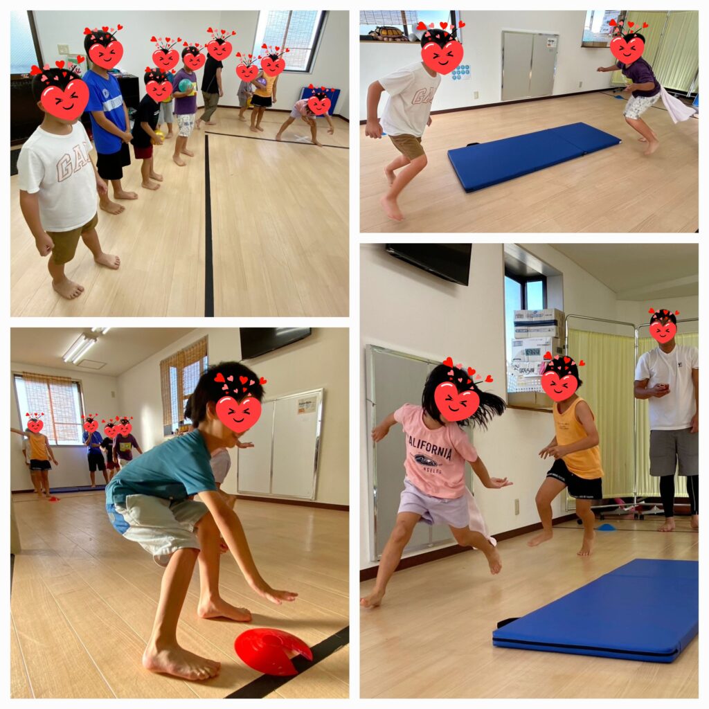 残暑が厳しくて💦お外で遊べない日は2階で運動遊びです😊年長さんから小4のお友達が勢ぞろいして「カッパコーンタッチ」「しっぽ取り」「的当て転がしボール」で体を動かしました😙