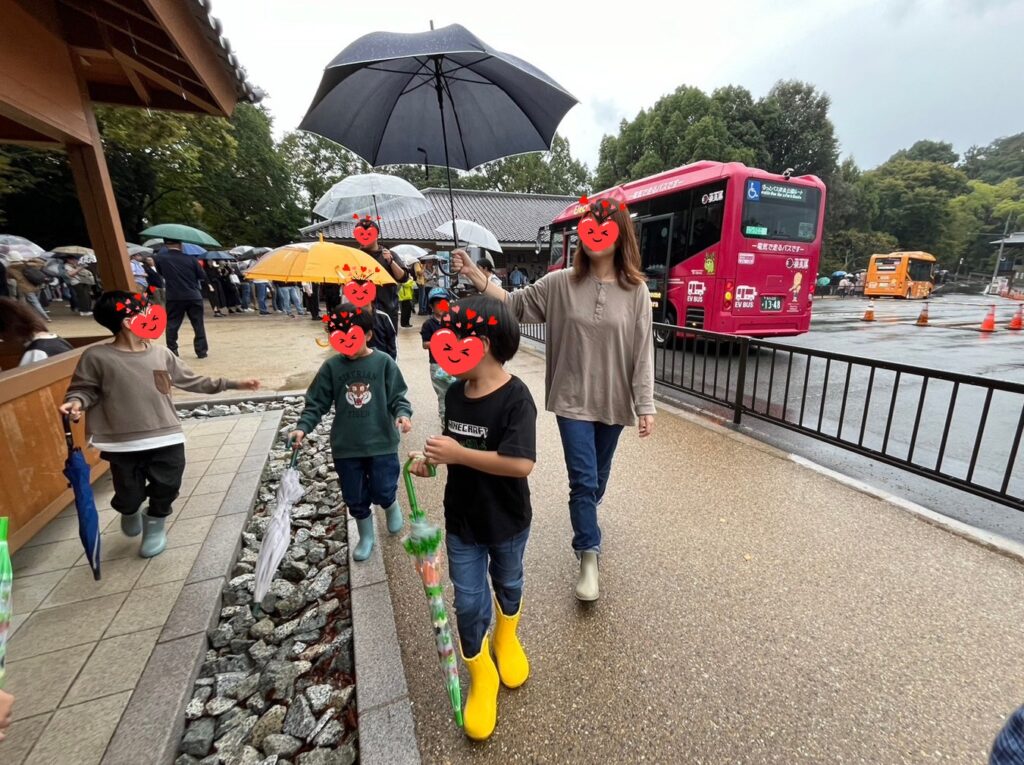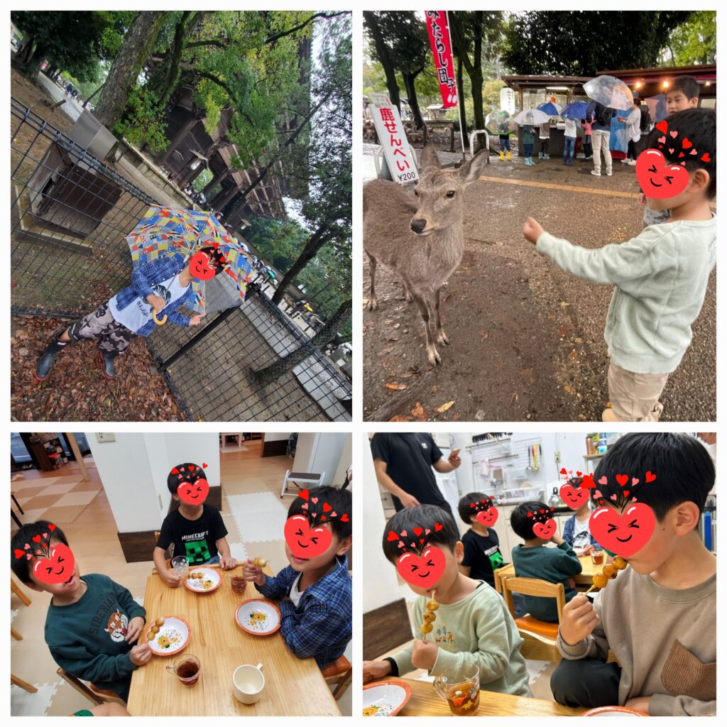 いったん大仏殿前バス停で降り、南大門を見に行く子や鹿を触りに行く子。。「前は青いバスで今日は赤いバスやったから今度はオレンジのバスに乗りたい!」と次のバス体験に想いをふくらませているお友達もいました🤗それぞれ少しだけ自由時間を楽しんでから、お団子屋さんでみたらし団子をおみやげに買って再び帰りのバスに乗車~🚌雨の中だったけど男の子達の元気パワーで楽しいバス体験となりました😝