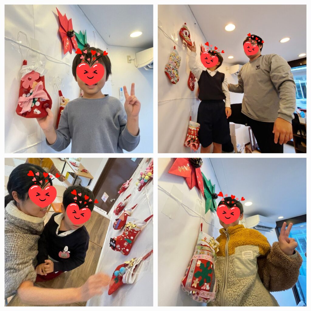 12月の壁面「ポインセチアと赤色のくつした飾り❇️👢」が完成しました😊大きな画用紙をいくつも折り込んだポインセチアとキラキラがいっぱいついた赤色のくつしたを壁にぶら下げるといよいよ室内のクリスマスムードが高まってきましたね~😝