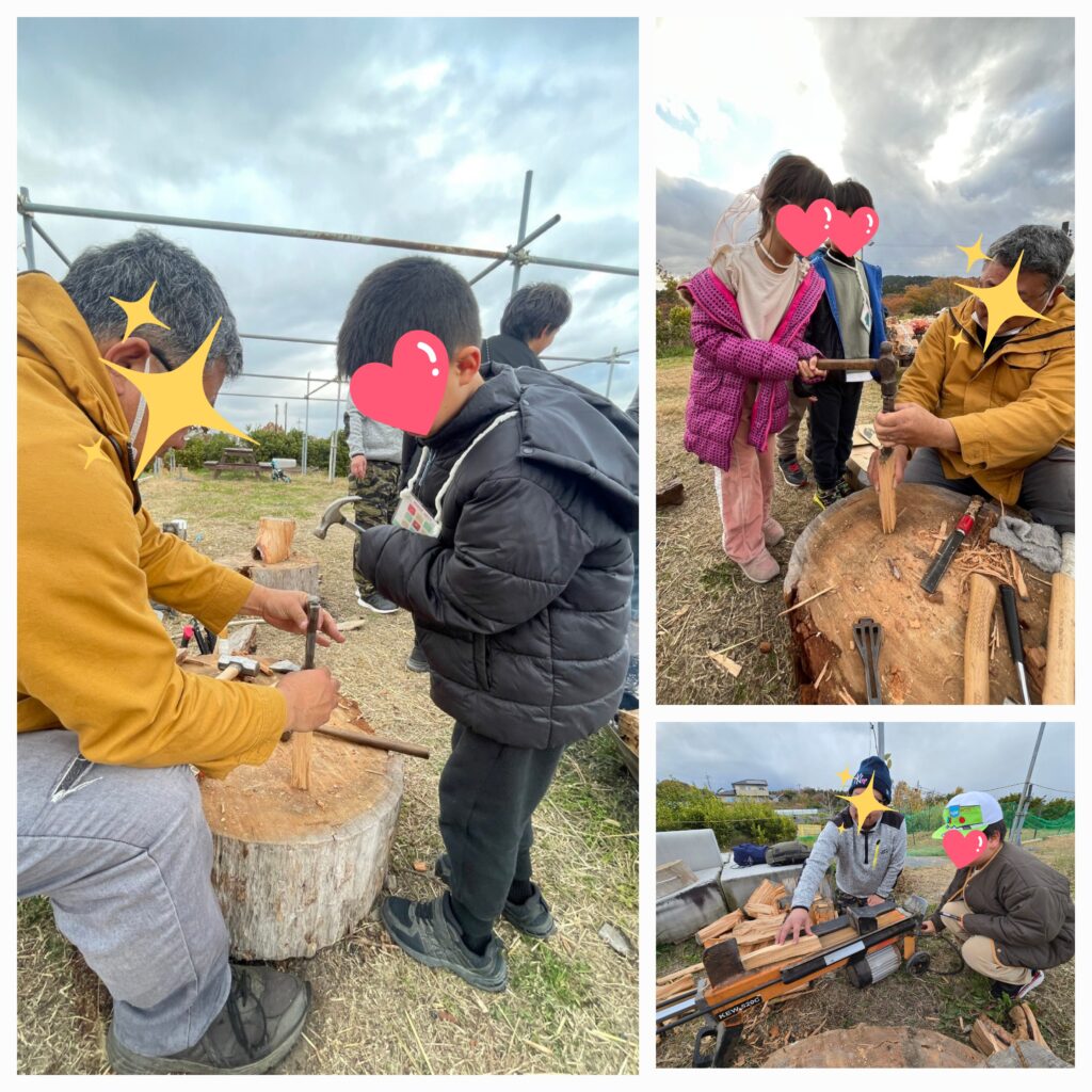 薪わり体験ではクナイを食い込ませて金づちでトントン打つ方法を教えてもらいました🔨薪わりの機械も見せてもらいました~😙