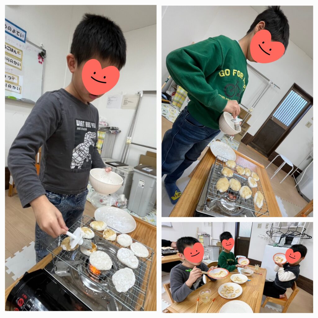 クリスマスが終わりいよいよ年末ムードが高まる中、ゆうでもおもちつきをしました😊おもち大好きな子達が集まって、炊きあがったもち米をめん棒を手に持ち一斉についてもらいました😚つきたてのおもちを丸めて、きな粉・ポン酢で味つけして、さとう醬油を塗って焼きもちにして。。みんなでお腹いっぱいになるまでたくさん食べました😋やっぱりつきたてはフワフワしてて食べごたえがあり美味しいですね~🥰