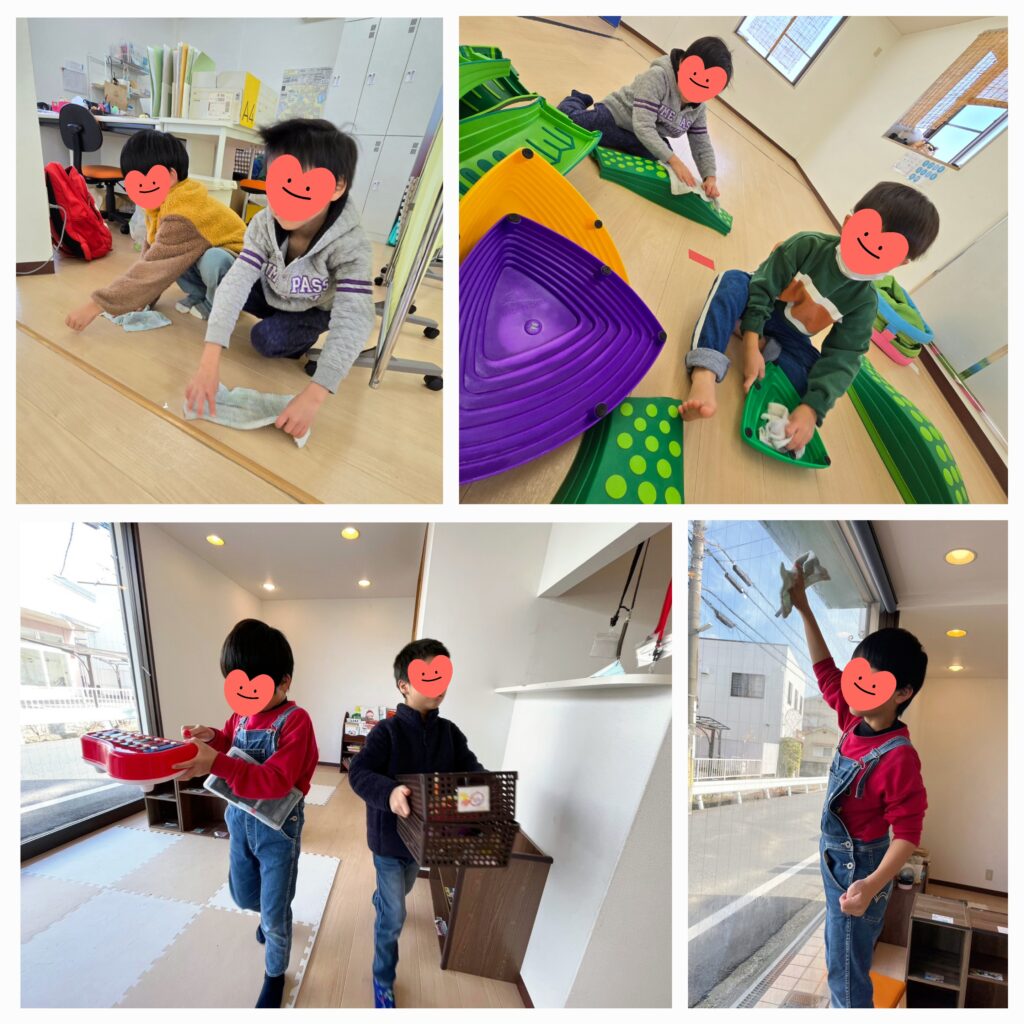 今年最後の日はゆうのおおそうじ😊床、サーキット道具、おもちゃ、ガラスをぞうきんでしっかり拭いてくれました🙆みんなとっても頑張ってくれたから、おやつの時間にタコ焼き買って公園で食べました~🤭