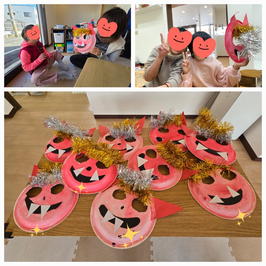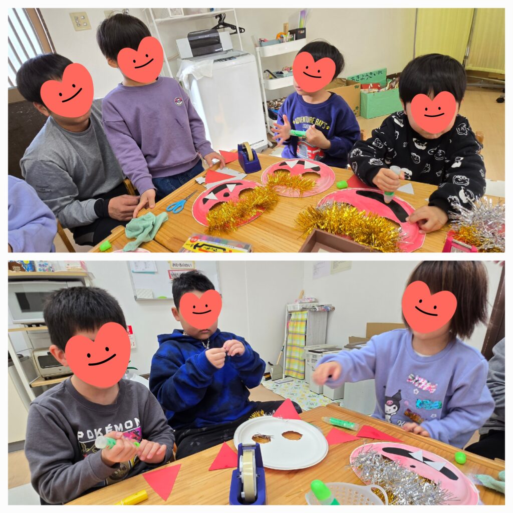 2月の壁面制作スタート!2つ穴のあいた大きな紙皿に金銀キラキラモールとツノやキバをくっつけましたら節分にやってくる例のあの方たちのお面完成です👹