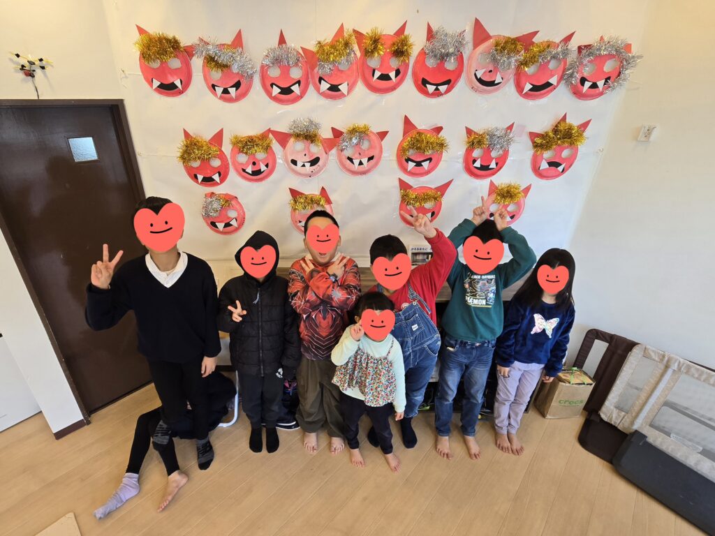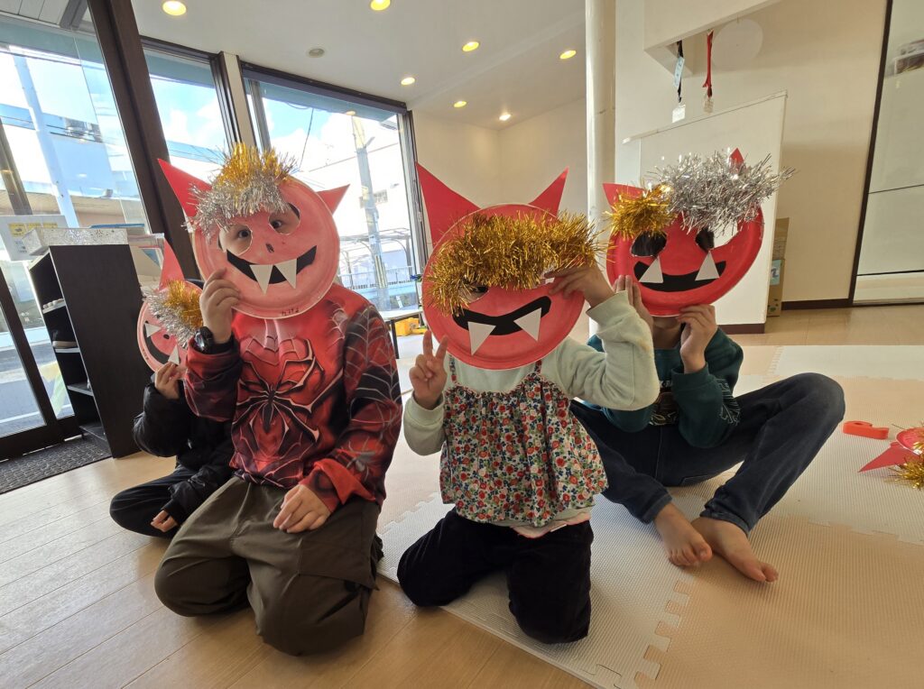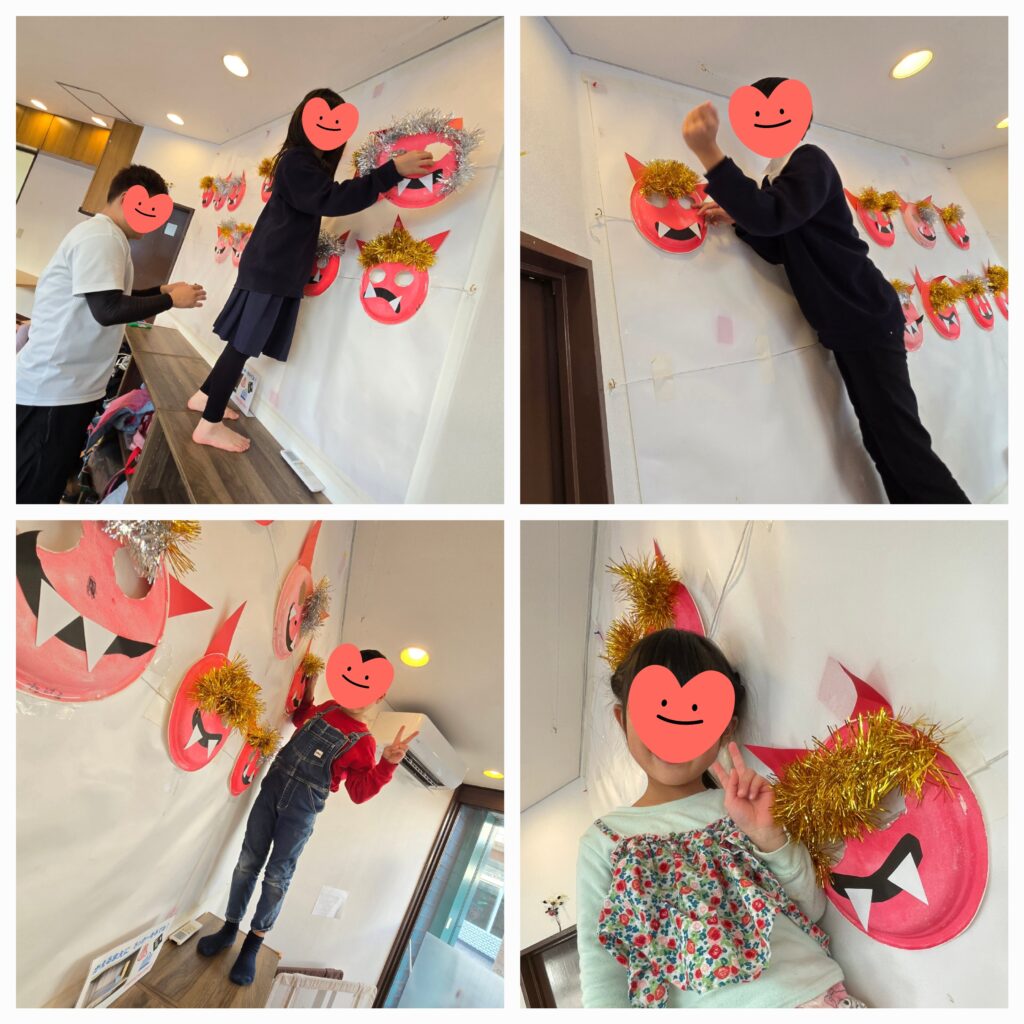2月の壁面「鬼のお面👹」が完成しました😊高い所に登って壁にしっかり貼りつけてくれました🙋たくさんの赤鬼さんが集まるとけっこう迫力ありますね~👹👹👹