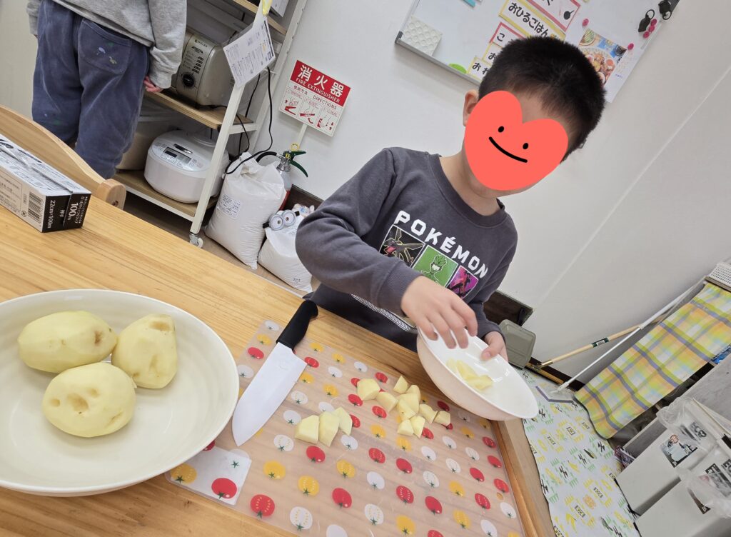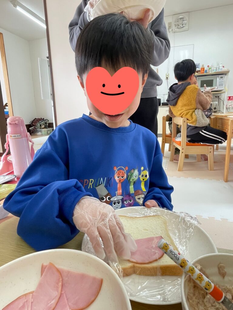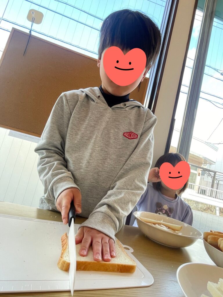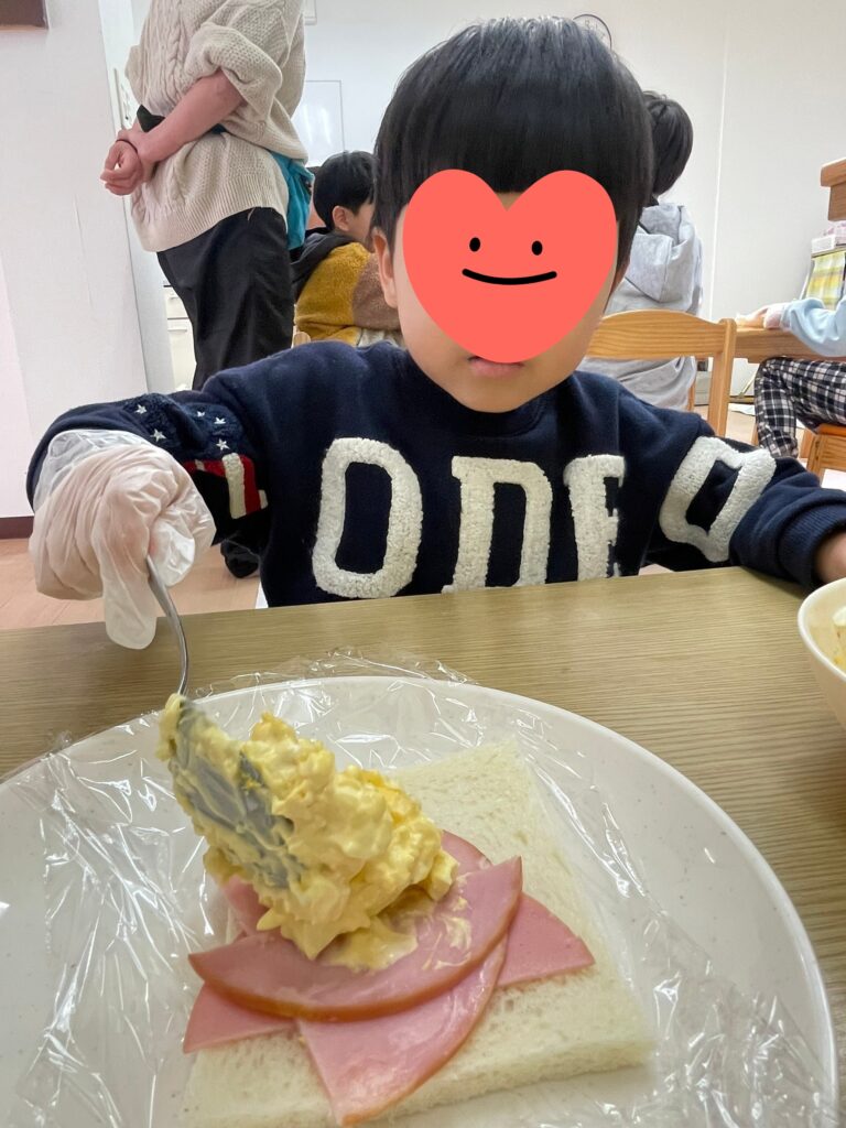 昼食クッキングで「サンドイッチ」「ジャーマンポテト」を作りました😊年中さんから小3まで10人の子ども達全員が仲良く楽しく料理してくれました🤗困っているお友達がいればそっと手伝ってくれている子がいたり、みんなでパンのみみを味見(つまみ食い?)したり、食パンに具材を挟んでコーンスープを添えて「いただきます!!」いつものようにたっくさん食べてくれました😋