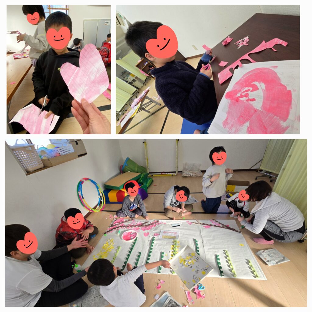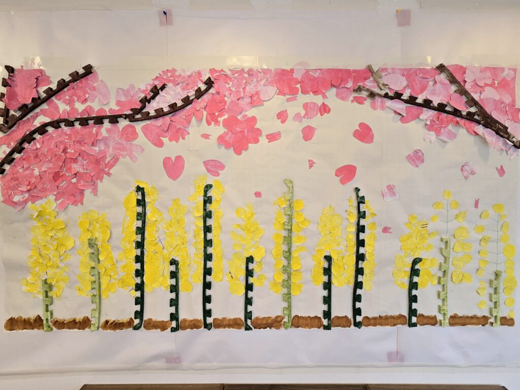 3月の壁面「春」が完成しました😊絵の具で塗ったピンク色の紙はハート形🩷、黄色の紙は丸型🟡に切って大きな方眼紙にどんどん貼りつけていったら、桜と菜の花が浮かび上がってきましたよ~