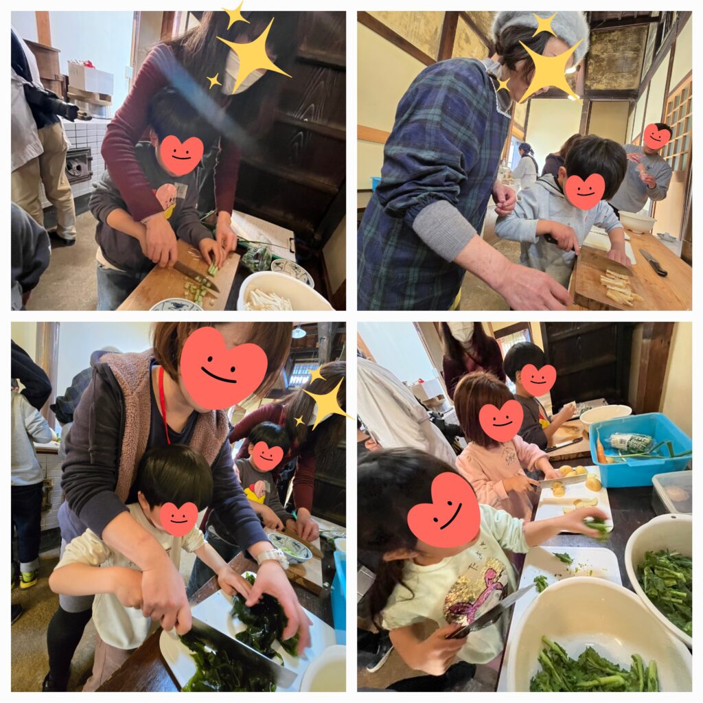 春のおでかけで「奈良町にぎわいの家」のかまど体験に参加してきました😊まずはお味噌汁の具材、大根・じゃがいも・人参・菜の花・えのき・ワカメ・油あげを切るところから。。大きな包丁を手にして、ゆうでのクッキングより慎重な様子で切ってくれていましたよ~👍