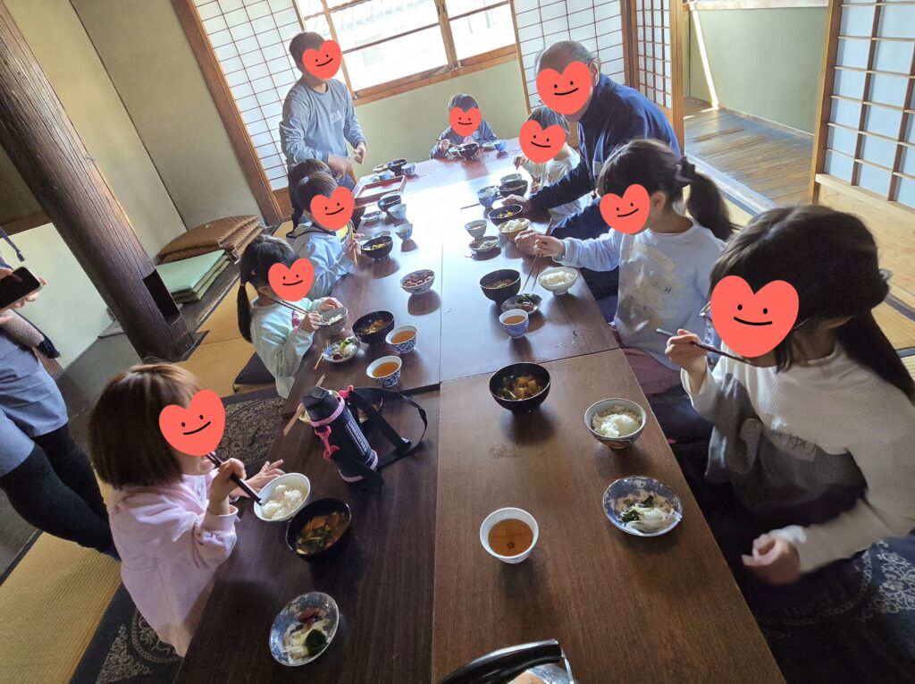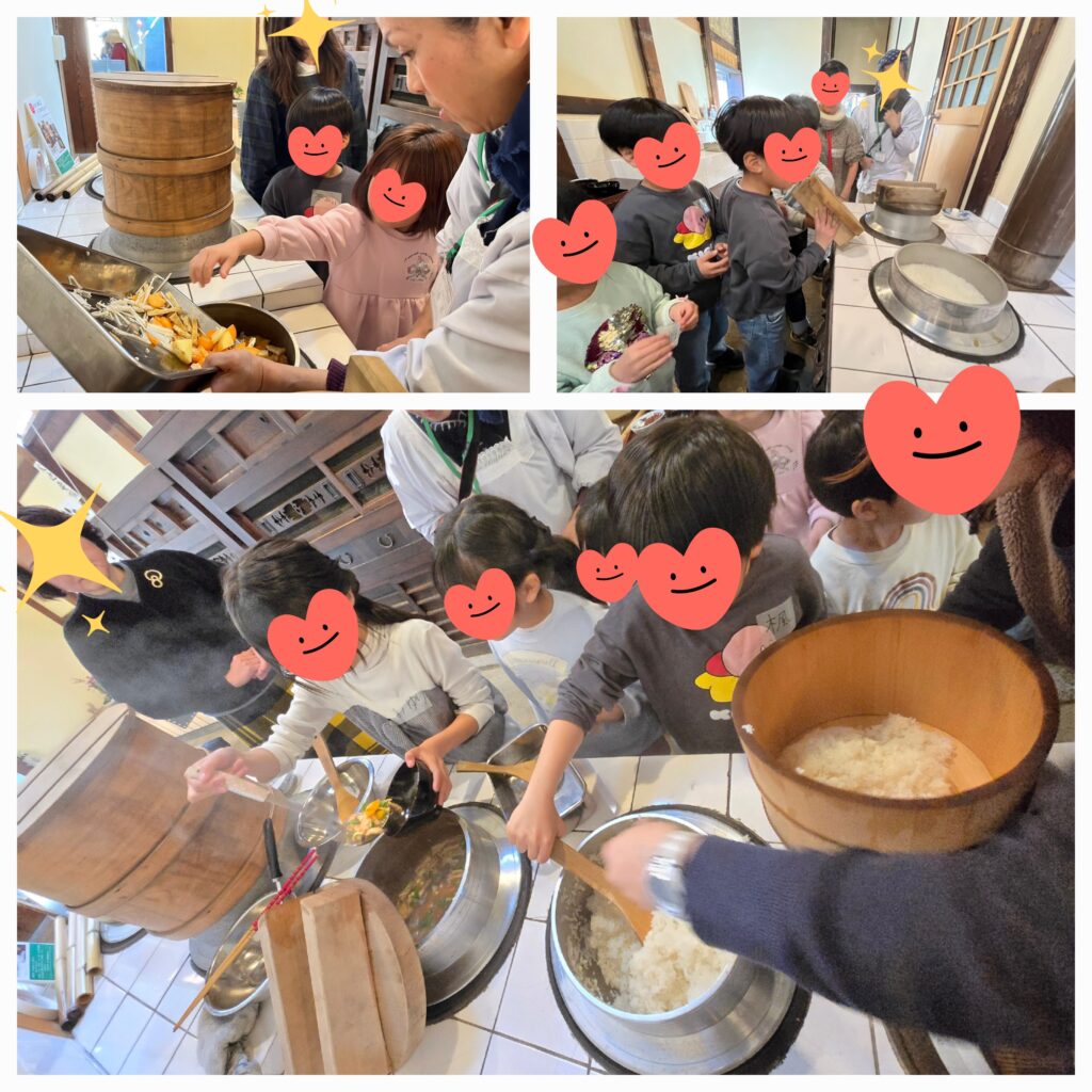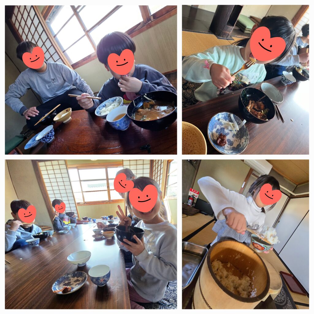 「ご飯が炊けてくるとお釜から湯気が出てきて香ばしい匂いがするからね。」「ほんとや~おもちの匂いする~!」「さぁフタあけるよ~!」「おいしそ~!」「おなかすいた~!」みんなで作ったツヤツヤご飯と具だくさんお味噌汁とスタッフさんが作って下さった大根ワカメの塩もみと梅干しを配膳したら「いただきます!!」何杯もおかわりして苦手な野菜もたくさん食べることが出来ました~😝