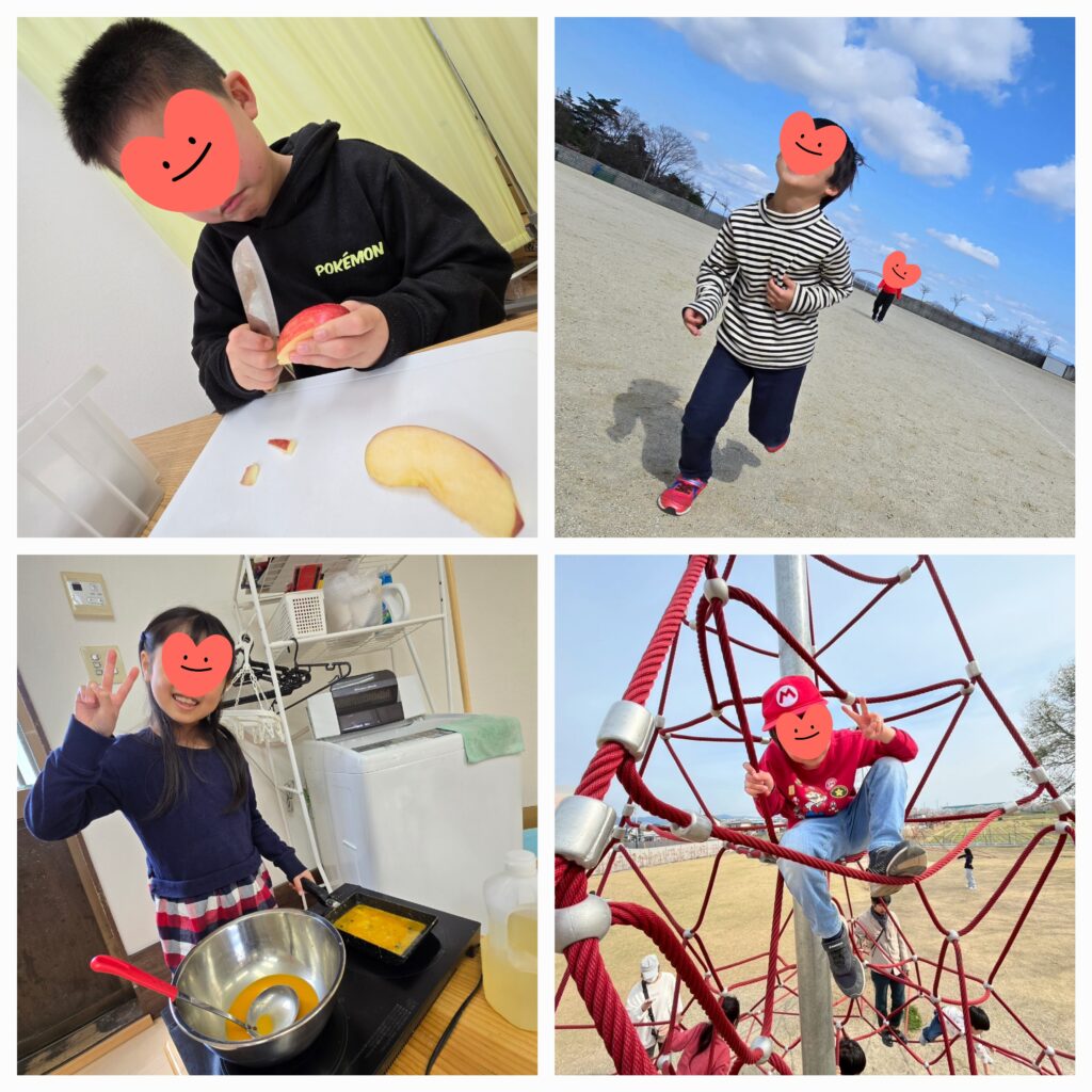 くだものナイフでリンゴをうさぎさんの形に切ってます。ひろ~い運動場の端から端までかけっこ。1人で玉子焼きに挑戦。スパイダーネットの隙間からハイポーズ。