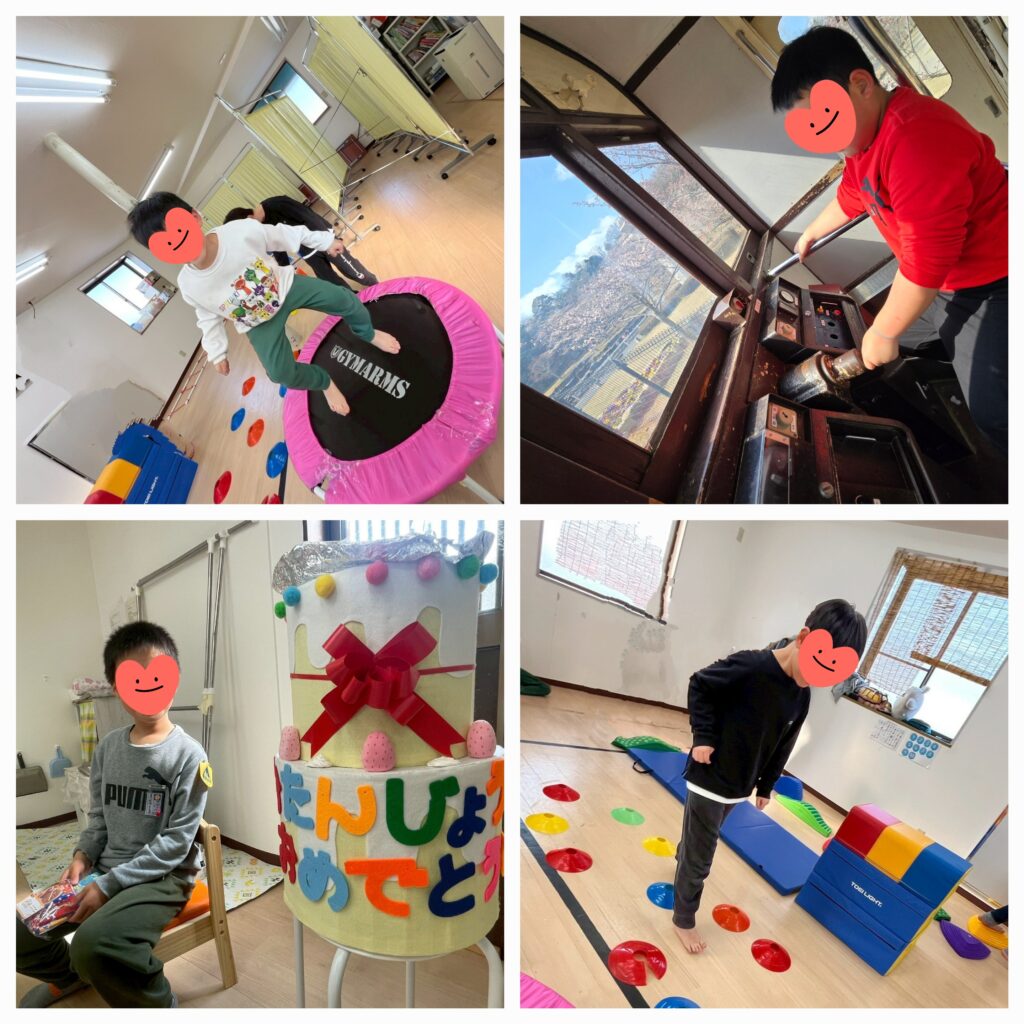 トランポリン10回ジャンプ。車窓の桜を見ながら。みんな楽しみ誕生日会。サーキットコースを攻略中。