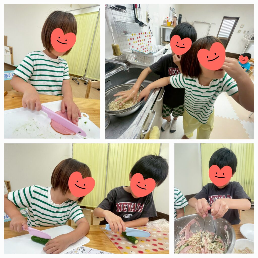 切り干し大根サラダチームは仲良し小2コンビ😚ハムもキュウリも慣れた手つきで切ってくれます🤭切り干し大根を水でもどす時はちょっと臭かったみたいで鼻をつまんでる~😓仕上げのマヨネーズの和え具合最高でした🙆