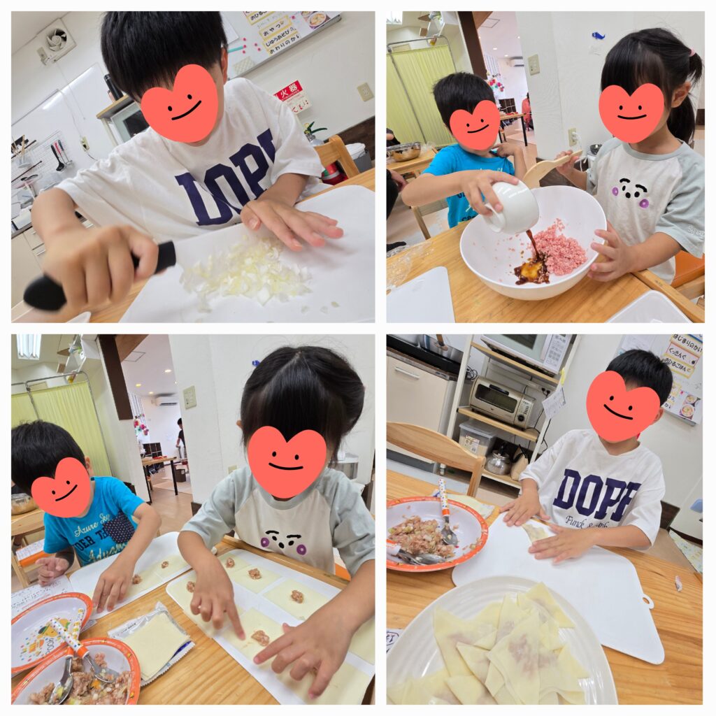 ワンタンスープチームはネギとミンチで肉のタネを作ったら、皮を一枚づつ並べてスプーンで適量乗せている小3のお友達を見習いながら園児のお友達も上手に三角に包んでくれました🤗