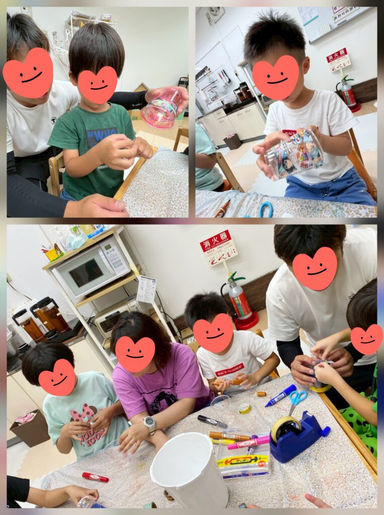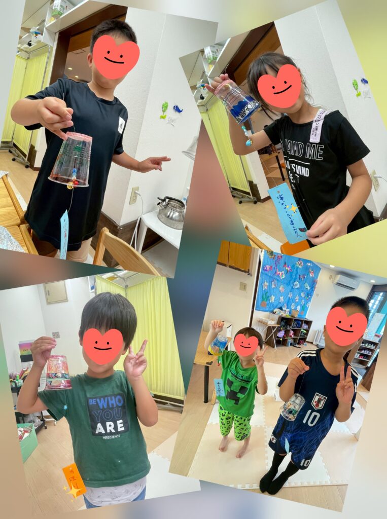 8月の壁面制作スタート!ビーズと鈴と短冊を通したテグスを、絵を描いたりシールを貼ったプラコップに吊るしました~😚短冊には「夏休みを楽しく過ごしたい!」「プールにたくさん行きたい!」とメッセージを書いて。。。🎐これから始まる夏が楽しみみたいです🤭