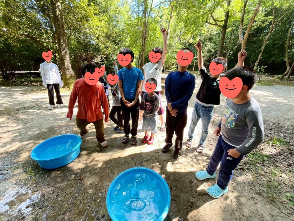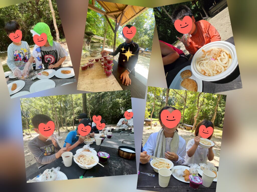何度か参加しているお友達は道中で「この道覚えてる~!」「この場所懐かしい~!」とワクワクな様子🤭初めて参加のお友達は「これから何すんの~?」とドキドキな様子🤭全員集まったところで昼食の準備から始めました🤗冷やしうどん、コロッケ、おにぎり、冷凍ゼリーを配膳したら「いただきま~す!」