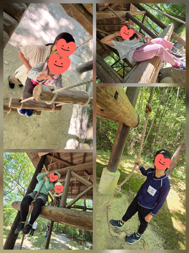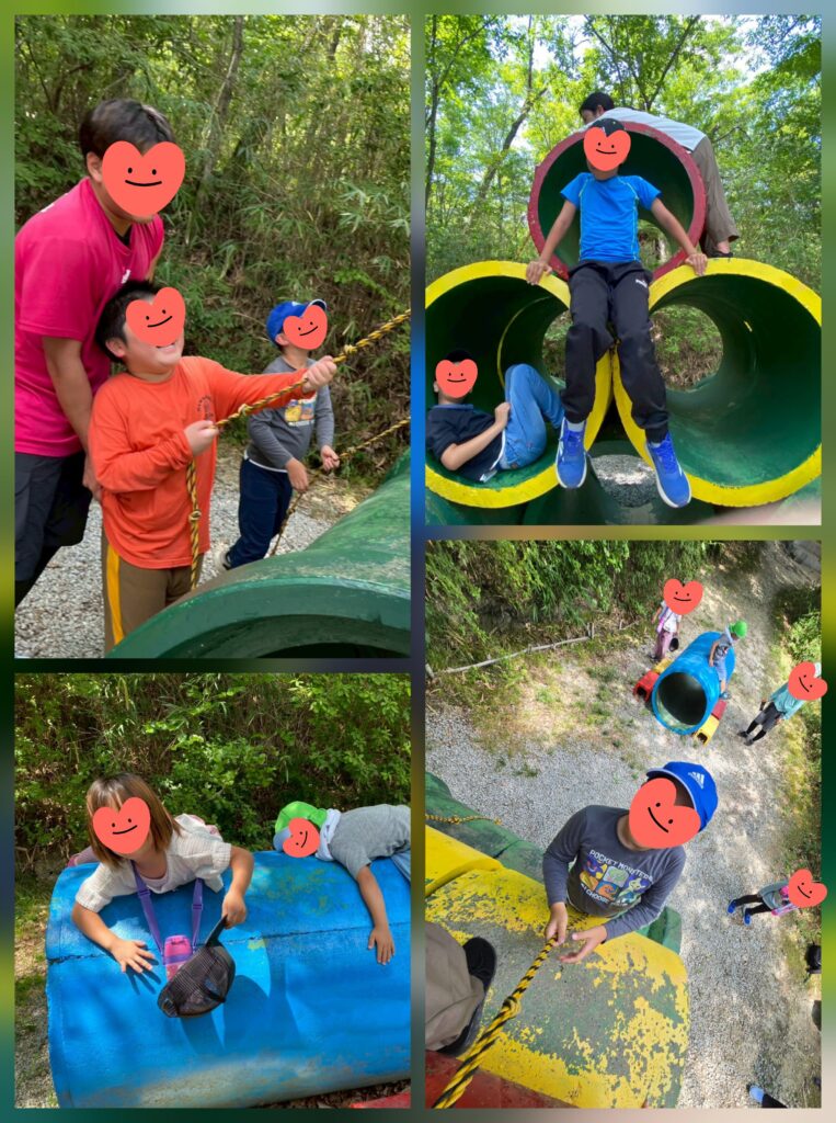 午後の部はまず土管・木の家エリアの遊びから~🎵「どうやって登るの~?」「どうやって降りるの~?」ロープのハシゴや木のハシゴは普段使い慣れてなくて職員さんに手伝ってもらいました🙆