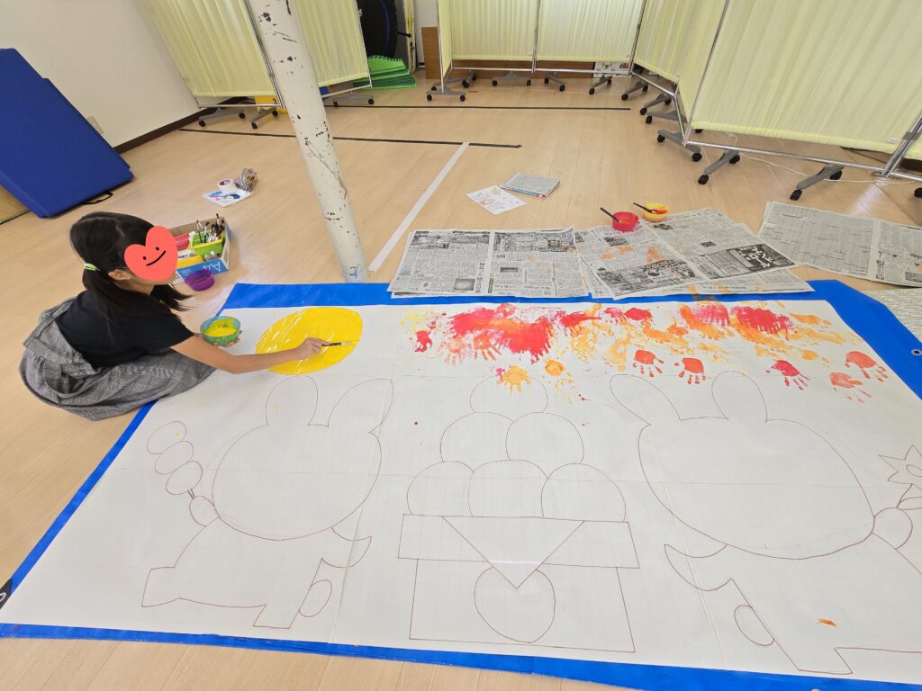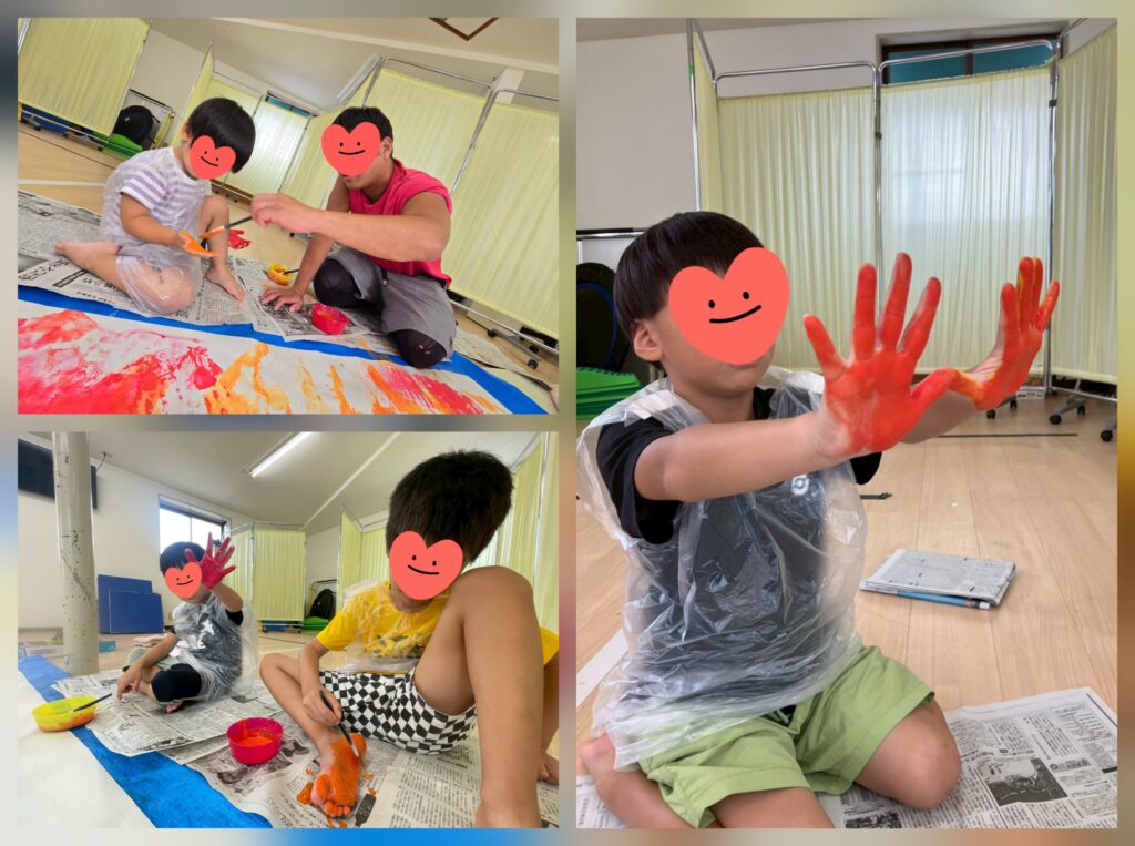 9月の壁面制作スタート!今回は手形足形スタンプに取り組みました✋👣手足に筆で塗り塗り~🎵連続でポンポンポンと押してみたり、はっきり色がつくようにギューっと押してみたり、綺麗な紅葉が出来ました🍁大きな満月も丁寧に塗ってくれましたよ~🌕