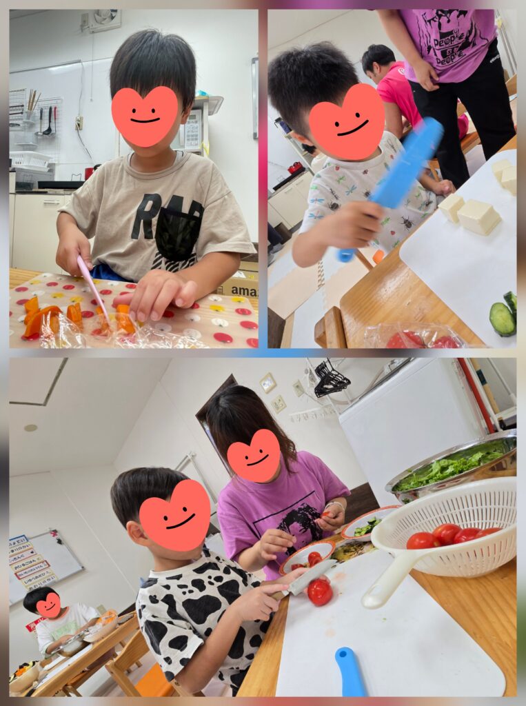 冷蔵庫から野菜を取り出して、洗って、切って、ちぎって。。自分で作ったら嫌いな野菜も一口食べてみようかなぁって気持ちになっていた園児の男の子🤭