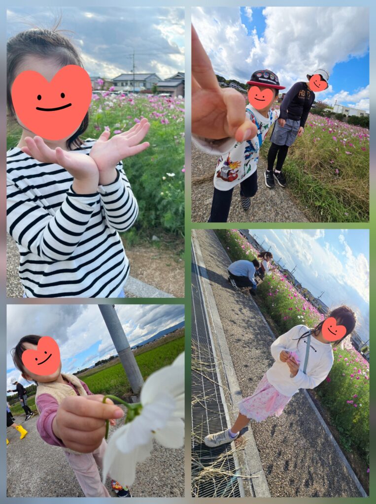 法起寺周辺にはコスモス畑が広がっていて、おんぶバッタやいなごを見つけながらあぜ道をの~んびり散歩しました😚